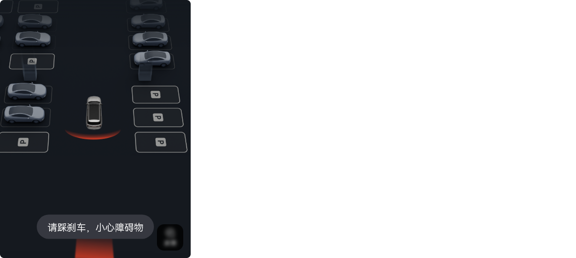 实施 RAEB 时,中控屏上会在自车后方显示动态红色弧线,并将风险目标红色高亮显示,伴有“请踩刹车”的文字提示,提醒驾驶员采取制动措施。