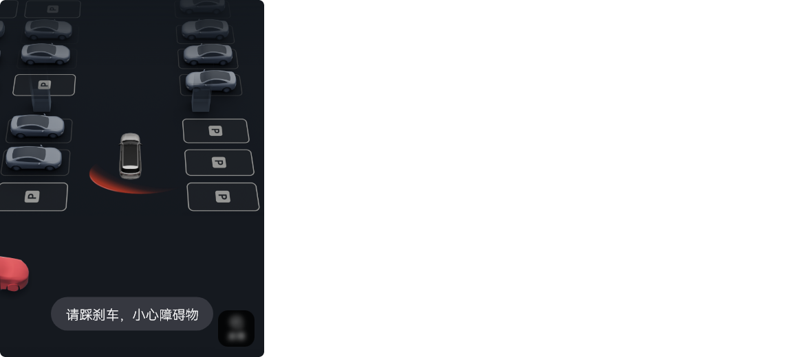 实施 RCTB 时,中控屏上会在自车侧后方来车方向显示动态红色弧线,并将风险目标红色高亮显示,伴有“请踩刹车”的文字提示,提醒驾驶员采取制动措施。