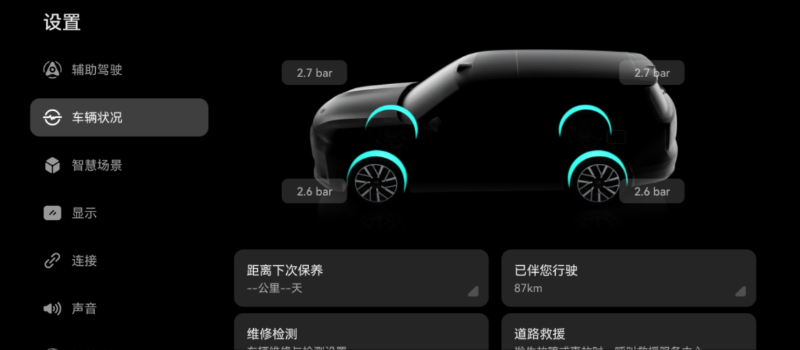 在中控屏进入“设置 > 车辆状况”,查看胎压信息。