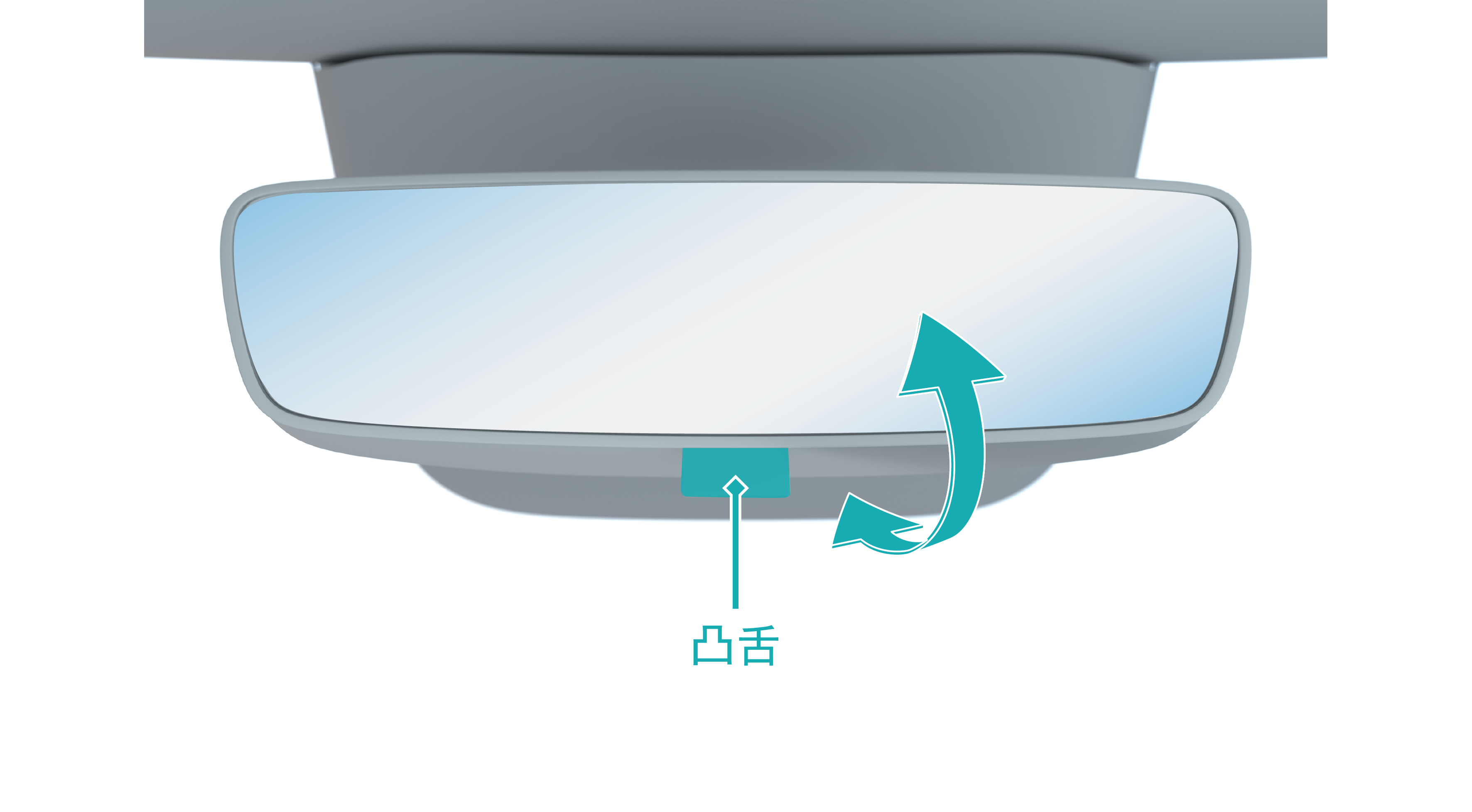如图凸舌在正常后视角度,向前拨凸舌,可使后方照射进来的反光偏置, 达到防眩目功能。