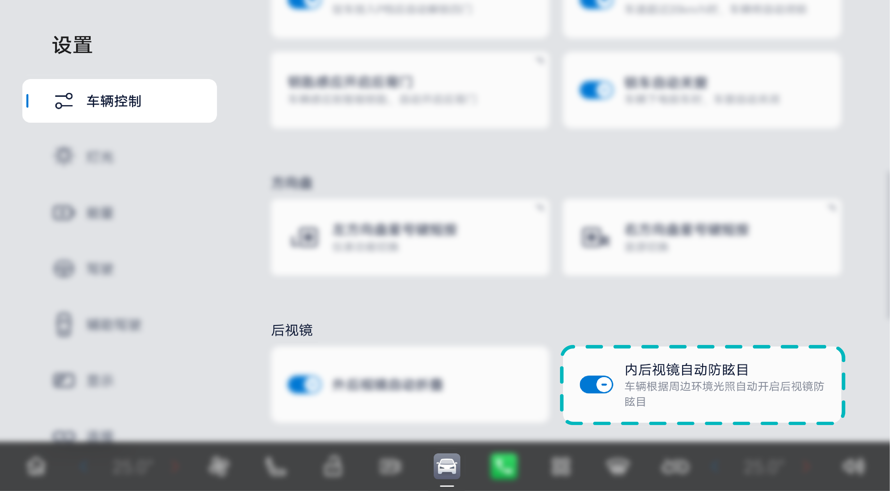 键进入“车辆控制→后视镜”界面,设置开启或关闭内后视镜自动防眩目功能。