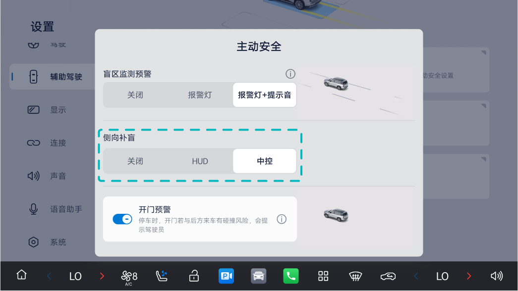 键进入“辅助驾驶→主动安全→侧向补盲”界面,开启侧向补盲显示功能,并选择显示区域为中控屏或HUD。当功能开启时,打转向灯则会在显示区域显示对应侧的侧向补盲影像,补充外后视镜视野盲区。