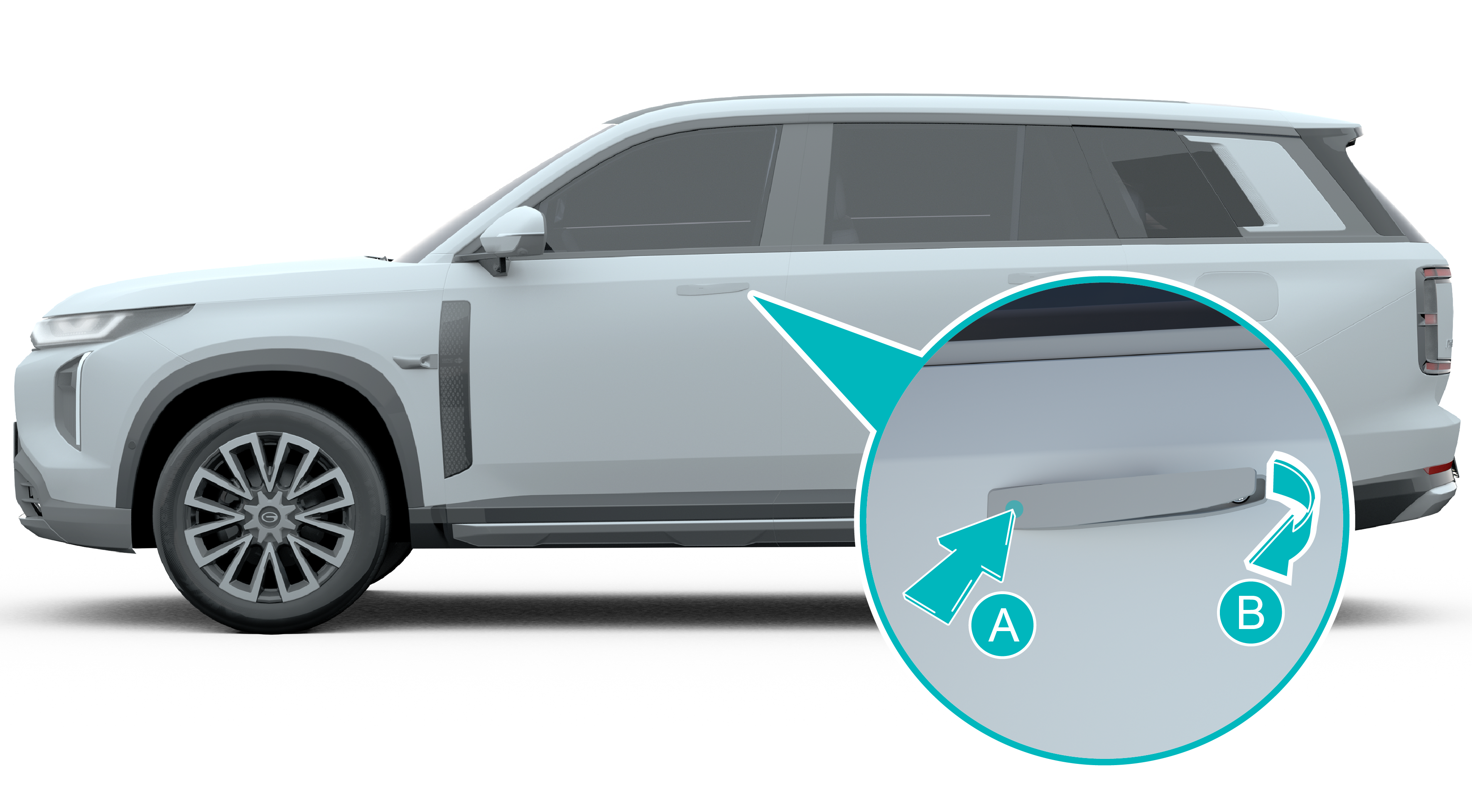 按压门把手-箭头A-位置,门把手后端翘起,沿-箭头B-方向将门把手向外拉起一定高度,尽量露出锁芯孔。