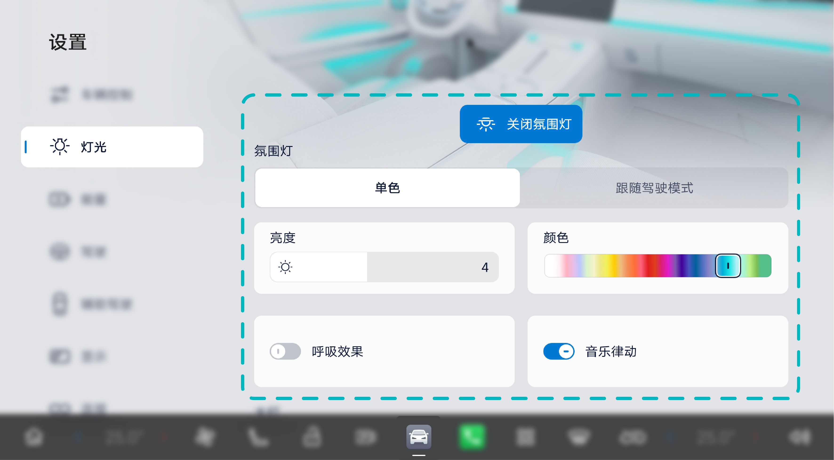 键进入“灯光→氛围灯”界面,设置开启或关闭氛围灯,开启后可自定义设置氛围灯效果。