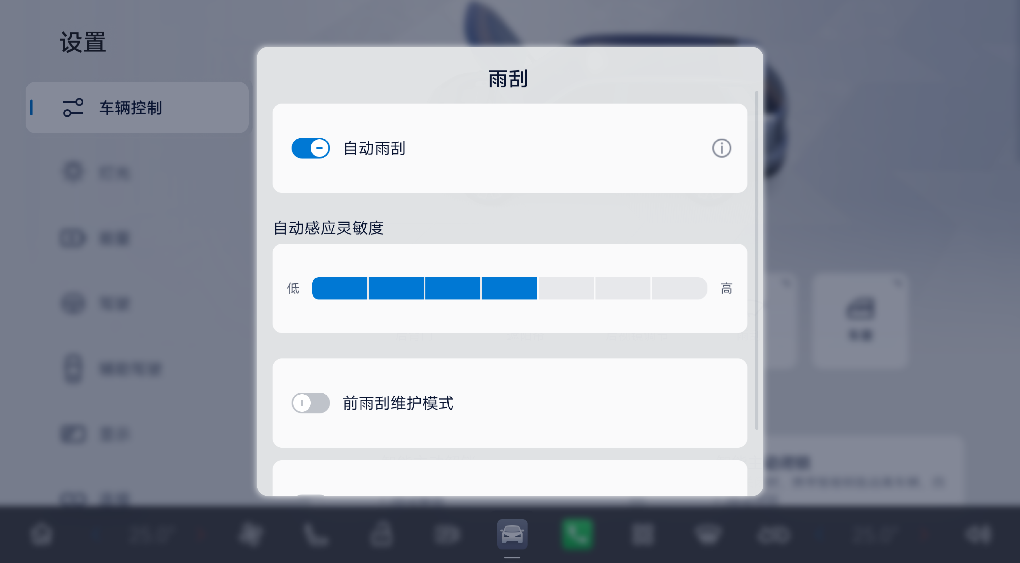 键进入“车辆控制→雨刮”界面,设置开启或关闭自动雨刮功能,功能开启后,可设置自动感应灵敏度。当功能关闭时,