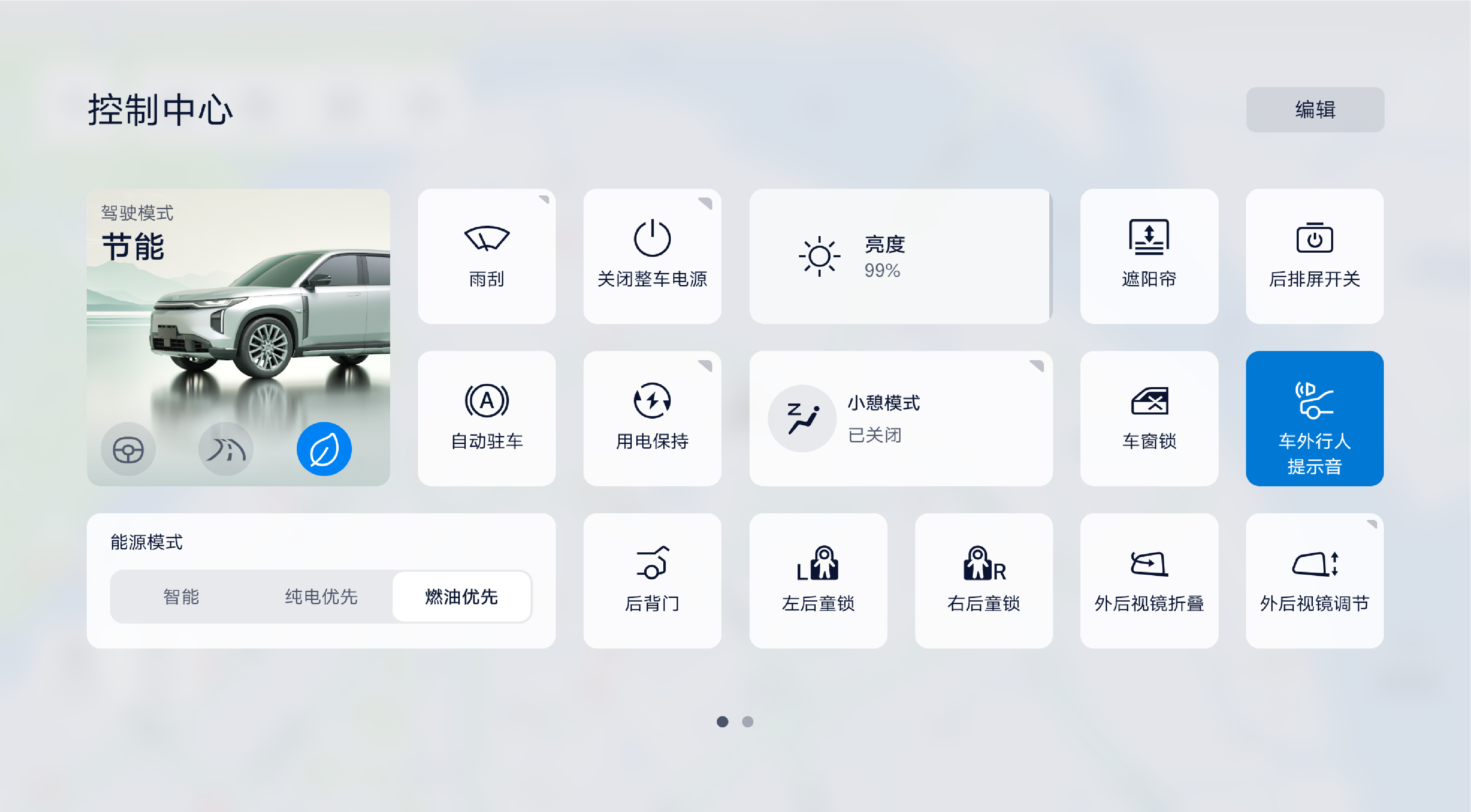 您可以通过控制中心快捷控制各项功能设置,包含:切换驾驶模式、调节亮度、开闭遮阳帘、开关儿童锁、开闭后背门等。