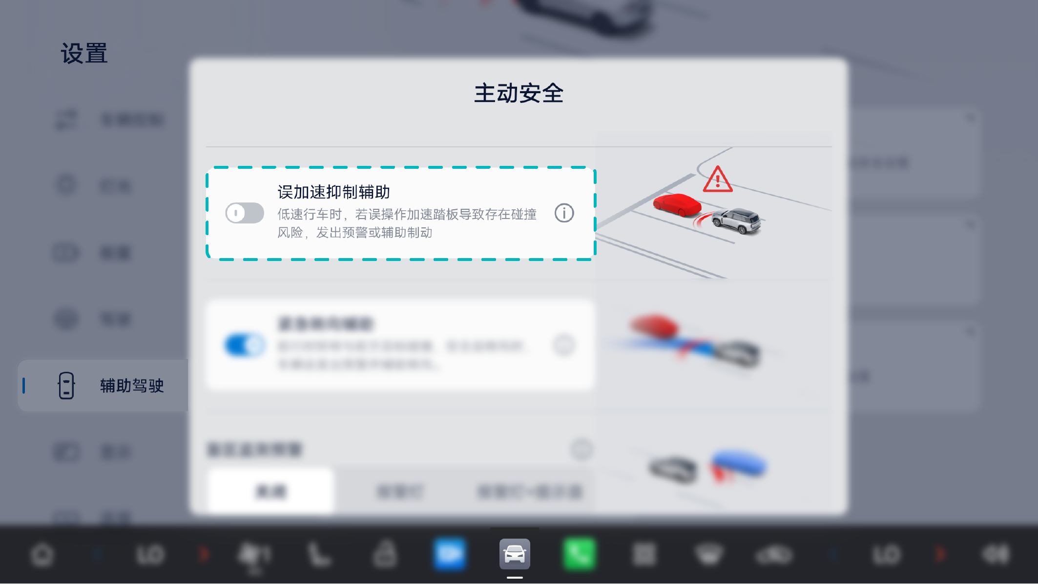 键进入“辅助驾驶→主动安全→误加速抑制辅助”,可设置开启或关闭误加速抑制辅助系统。