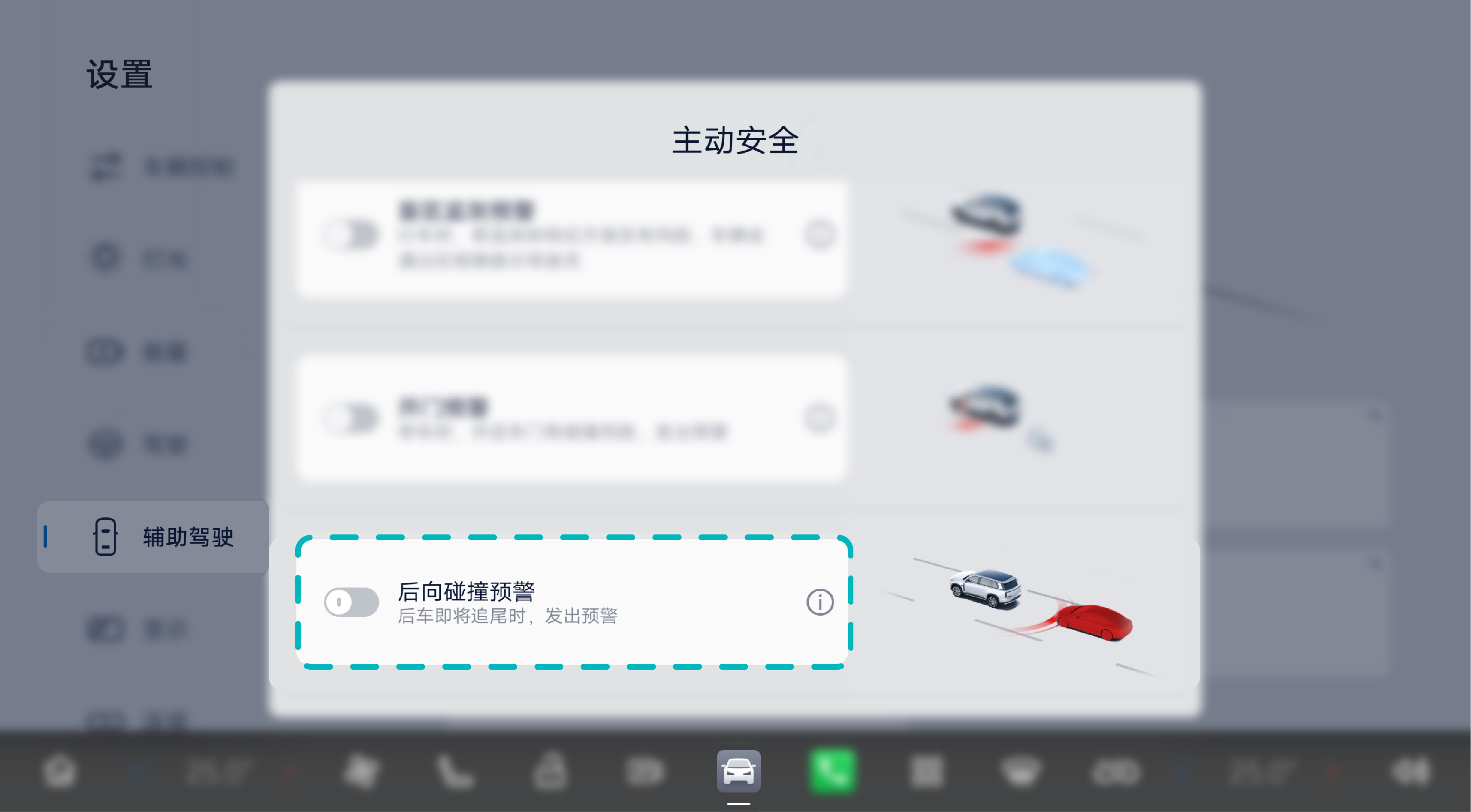 键进入“辅助驾驶→主动安全→后向碰撞预警”,可设置开启或关闭后向碰撞预警系统*。