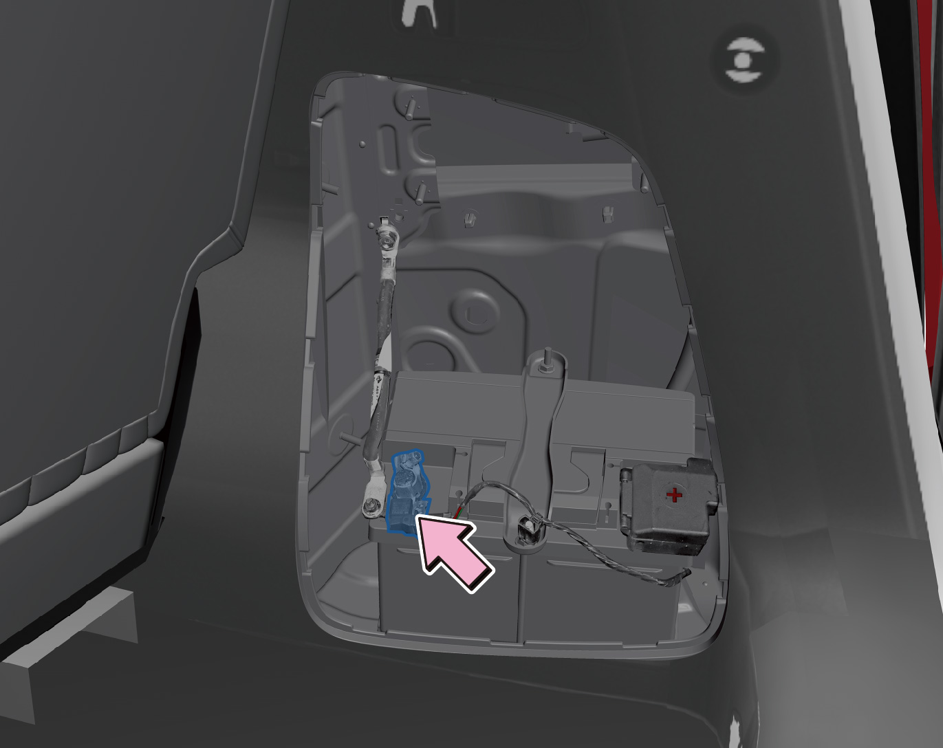 打开后背门,撬开行李箱右侧装饰盖,断开低压蓄电池负极。