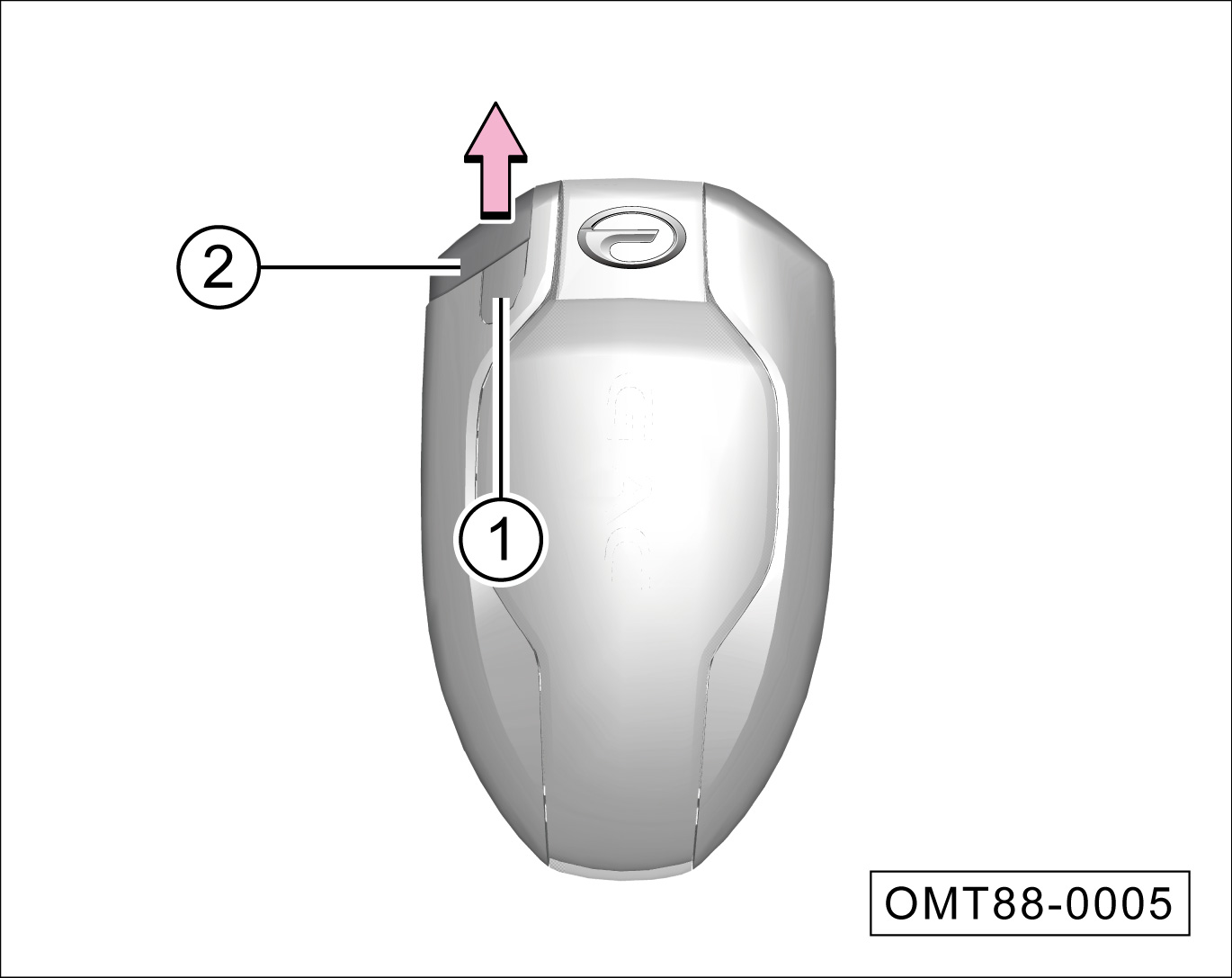按压锁止按键①,同时沿-箭头-方向取出应急机械钥匙②。