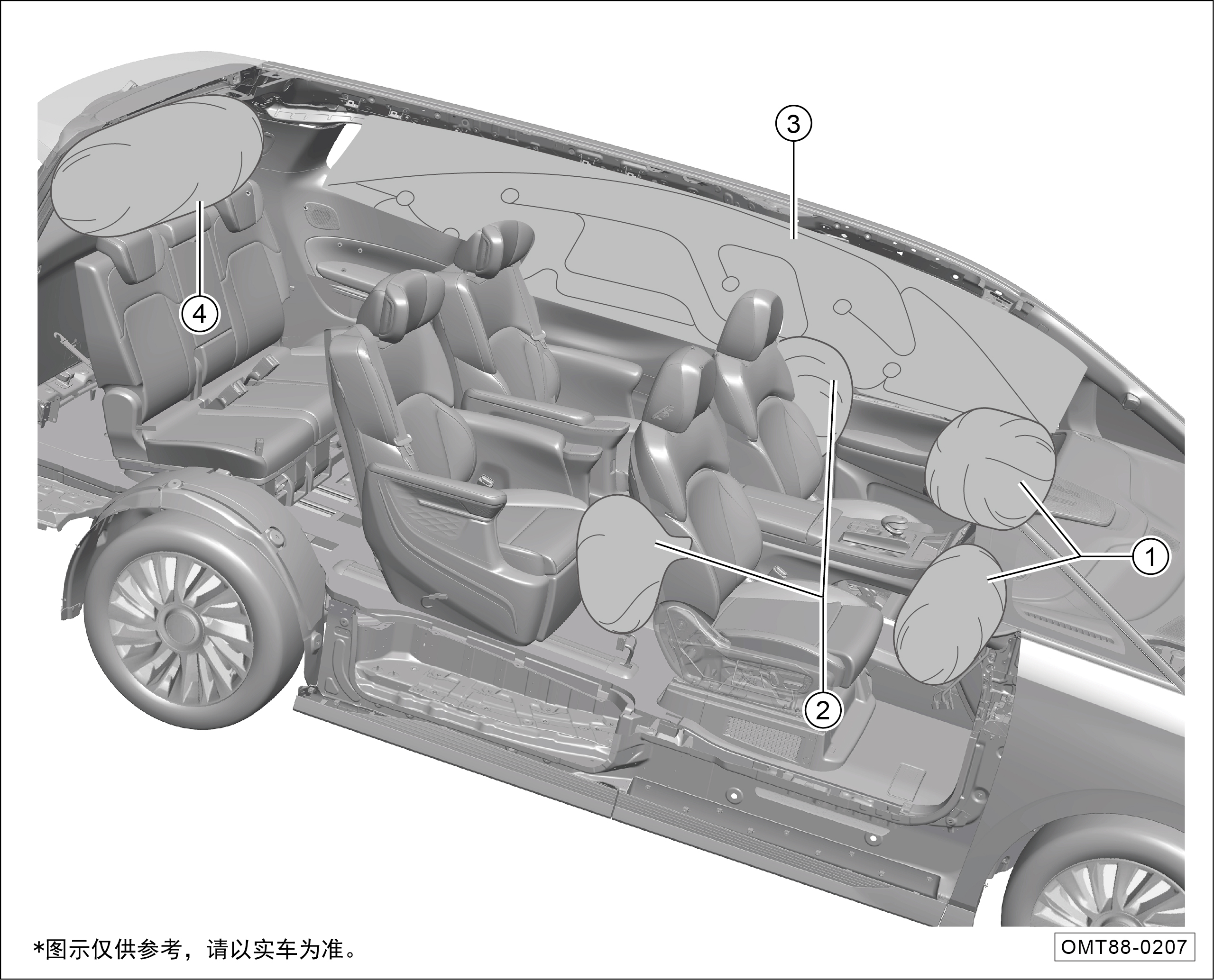 根据不同配置,安全气囊系统有以下膨胀示意位置: