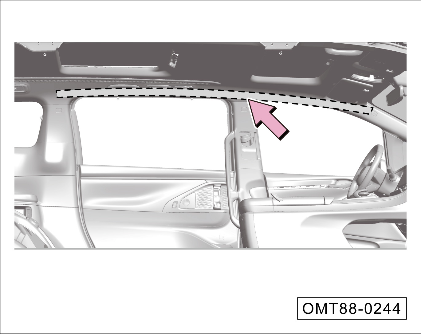 侧窗帘式安全气囊安装在顶棚左、右两侧内部(虚线阴影部分),饰板上标记有“AIRBAG”字样。