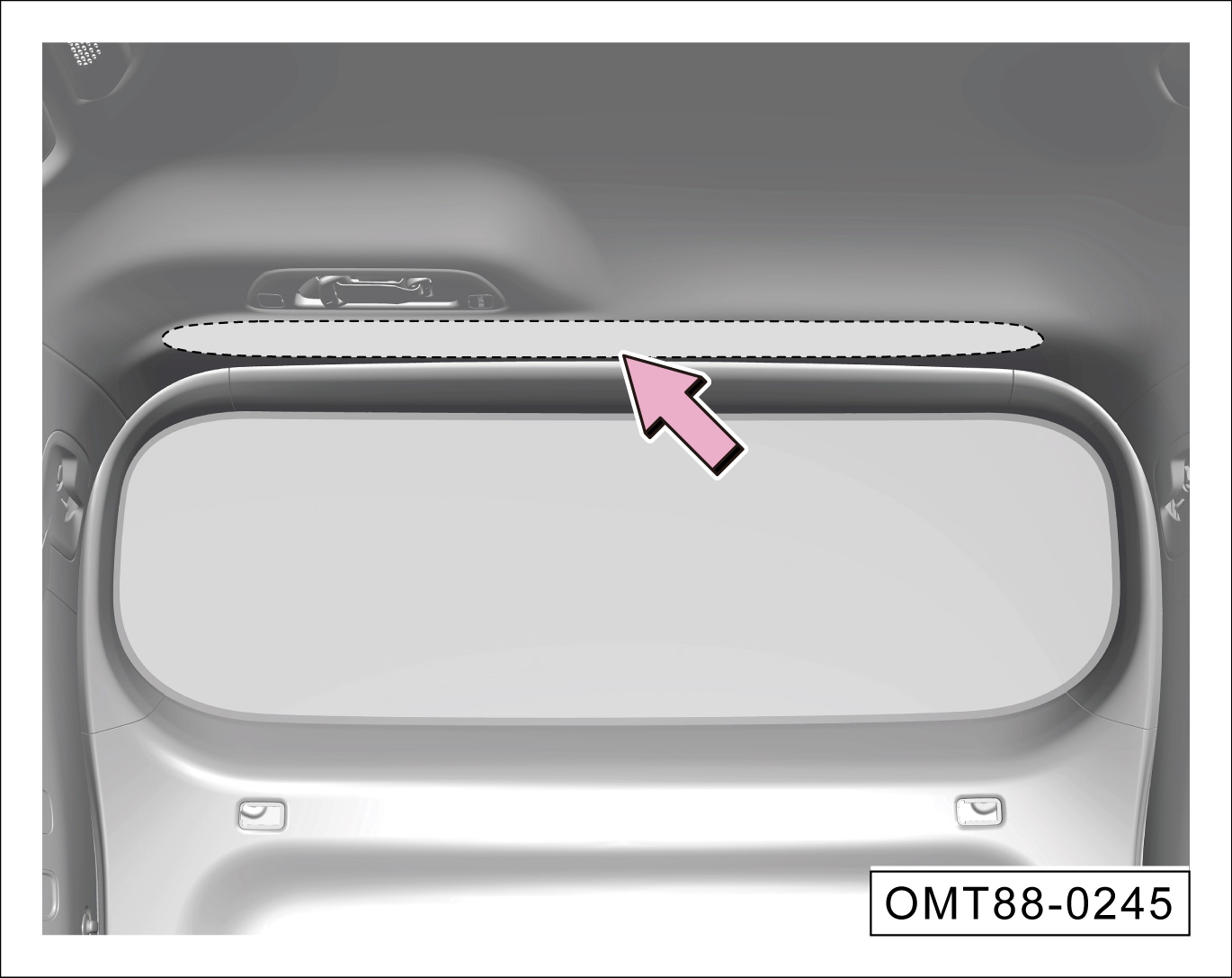 后风窗安全气囊安装在顶棚后方内部(虚线阴影部分),饰板上标记有“AIRBAG”字样。