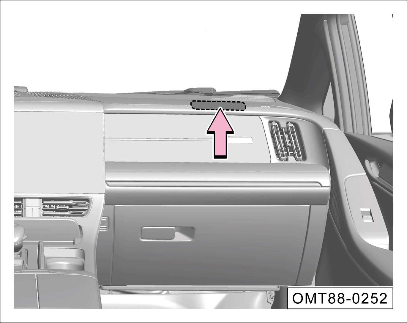 前排乘员正面安全气囊安装在仪表台内部(虚线阴影部分),仪表板上标记有“AIRBAG”字样。