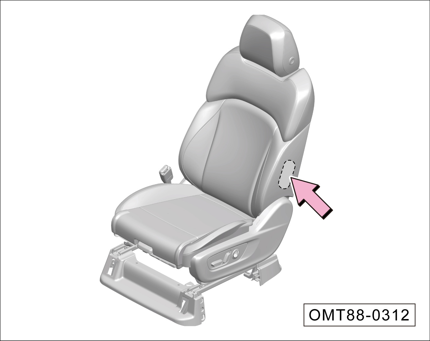 前排侧面安全气囊安装在驾驶员座椅及前排乘员座椅靠背向门侧内部(虚线阴影部分),座椅外侧标记有“AIRBAG”字样。