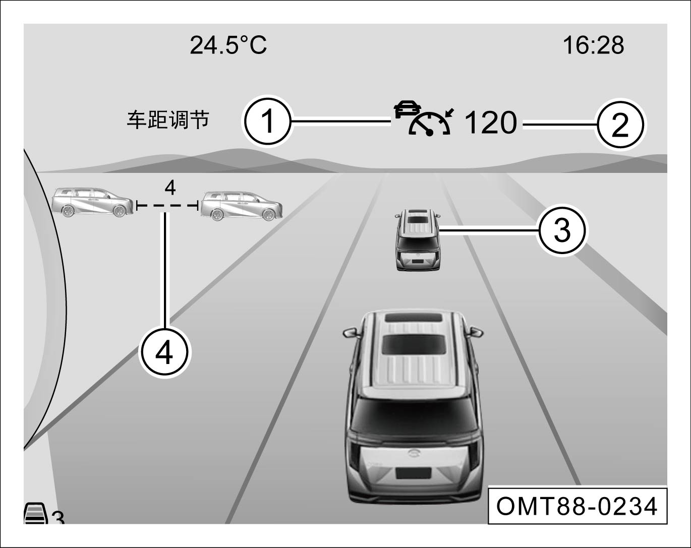 整车电源切换到“ON”挡位后,系统开启时与前车的距离为上次记忆挡位(四挡跟车距离最远)。