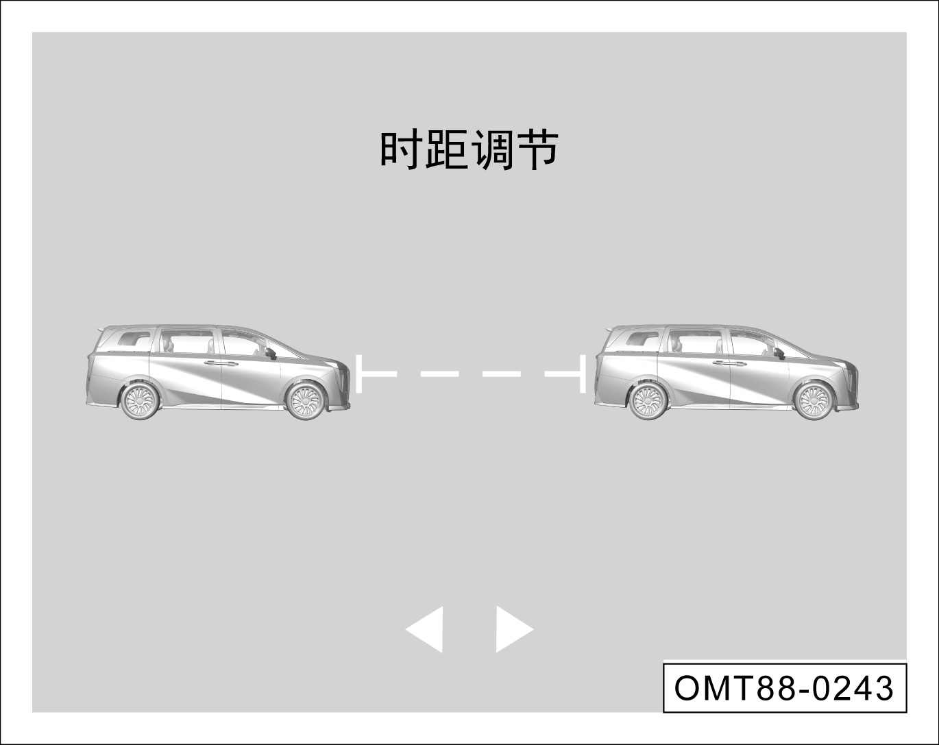 键,可切换与前车距离的挡位,按一次切换一挡,切换顺序分别是“第一挡→第二挡→第三挡→第四挡”,“第四挡→第三挡→第二挡→第一挡”。同时,组合仪表显示屏中将显示与挡位数量相同的横条。