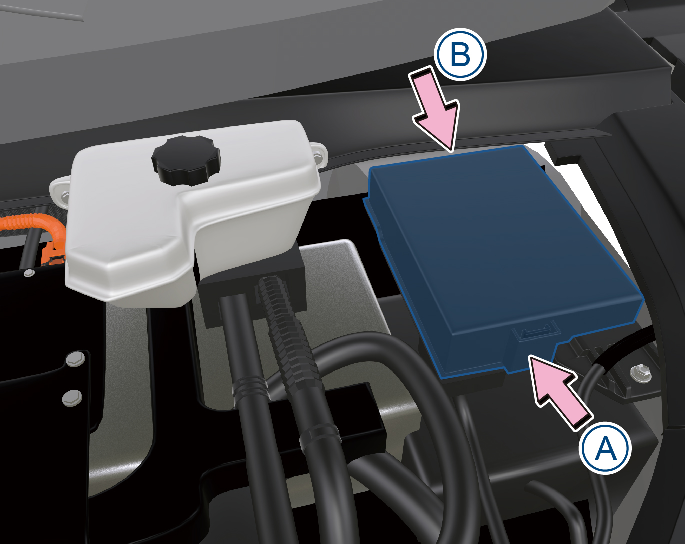 打开前机舱盖,在左车轮处找到线束保险盒,沿-箭头A-和-箭头B-(雨刮盖板下方)方向按压固定卡扣完全解锁,然后掀起盖子。
