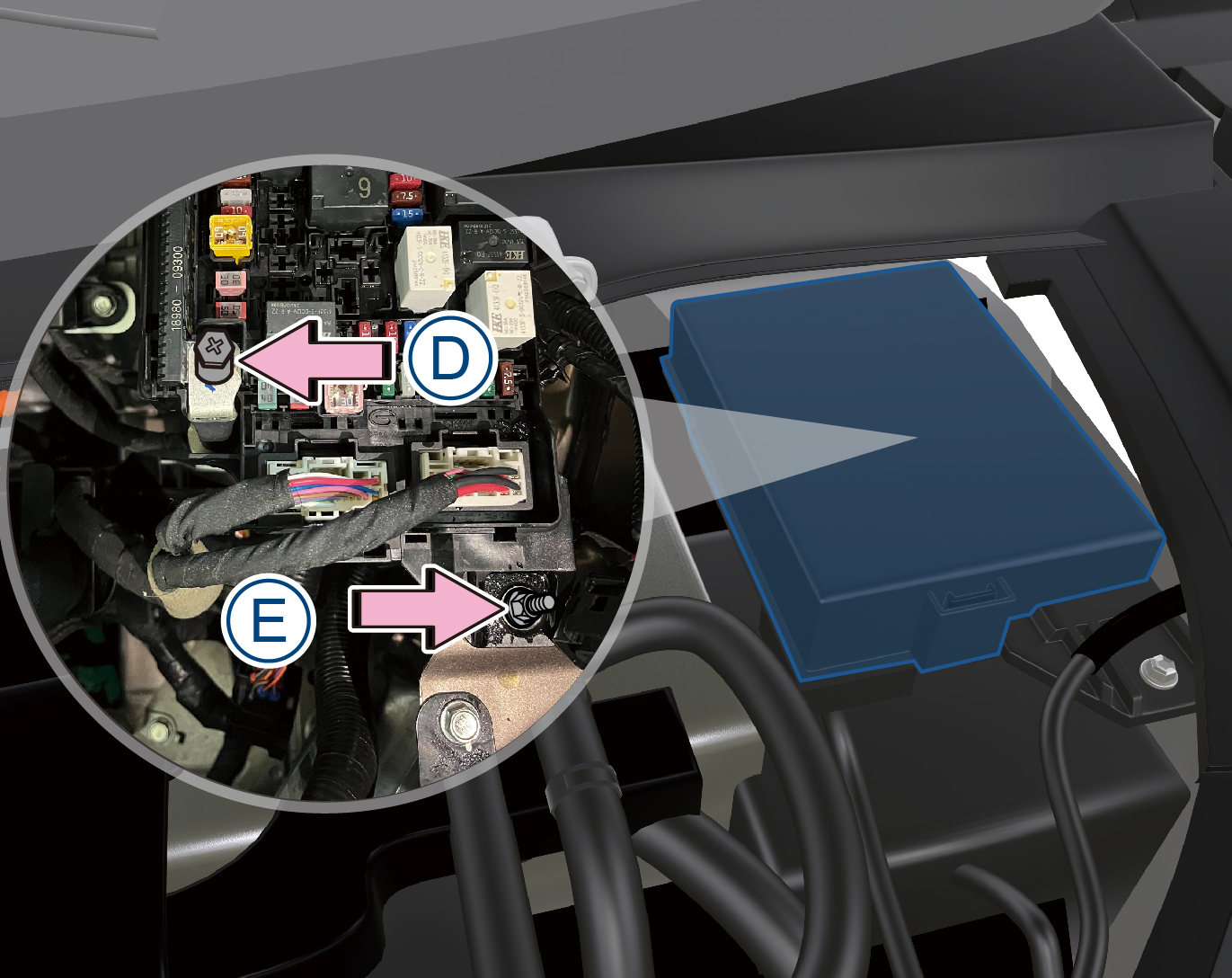 将正极跨接电缆的卡夹连接至本车专用跨接启动端子-箭头D-,另一端接另一辆车辆低压蓄电池正极。将负极跨接电缆的卡夹连接至本车的-箭头E-,另一端接另一车辆的低压蓄电池负极。
