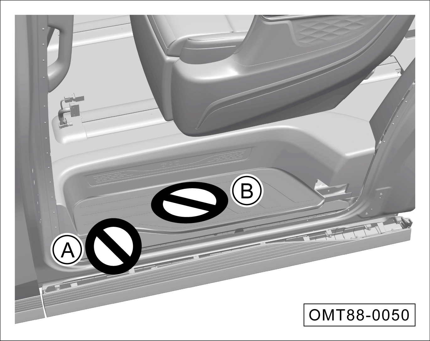 滑移门开启或关闭过程中,B区域滑移门门槛踏板处禁止放置物品或者乘员将脚放在该区域。