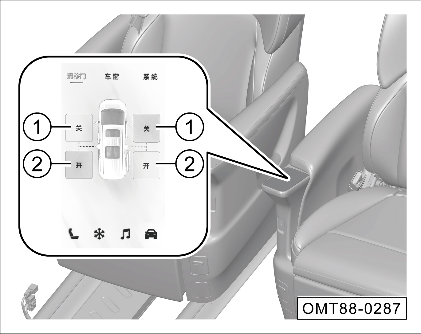 按滑移门按键①,电动开启对应侧滑移门。