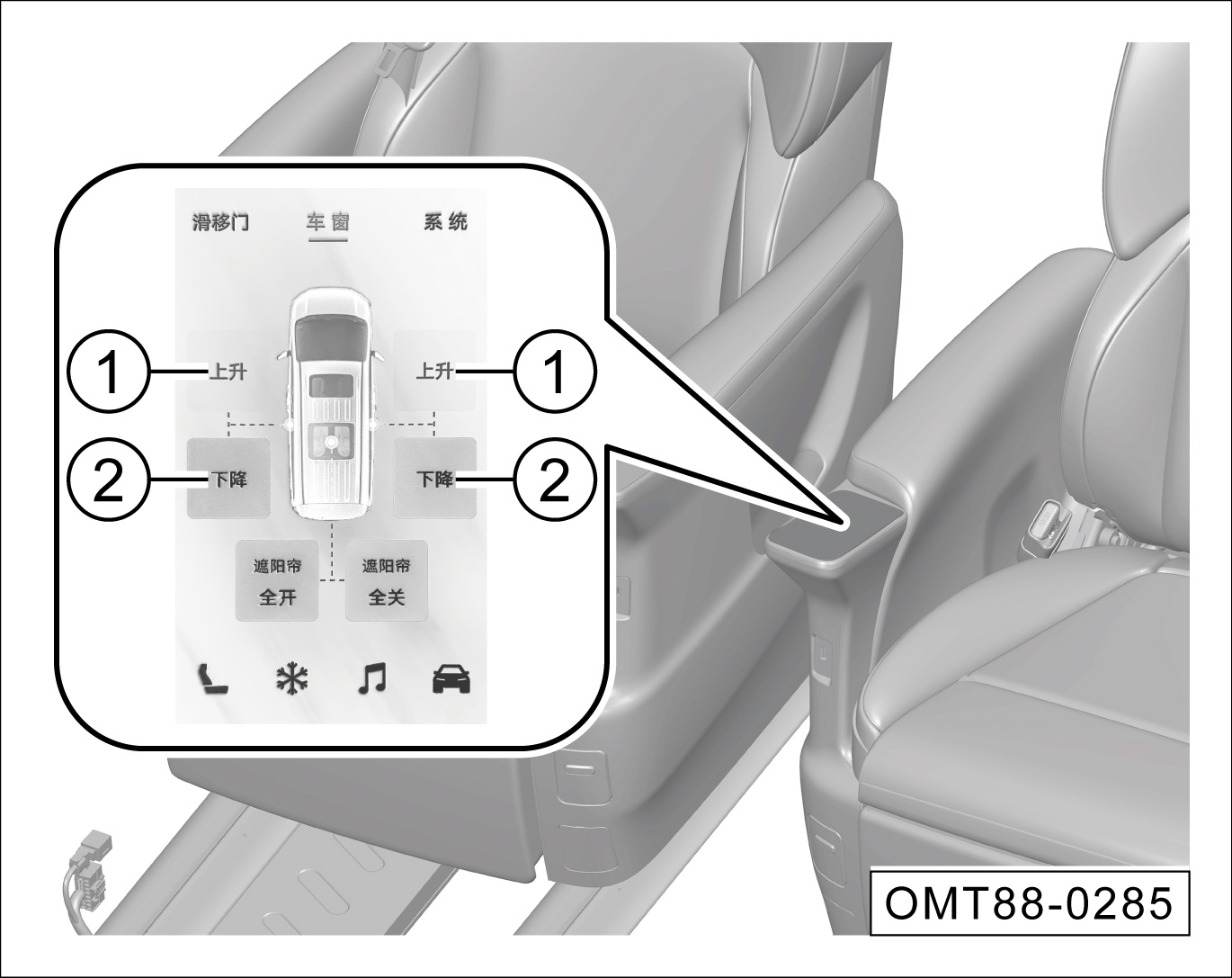 长按软按键①,对应侧车窗将向上关闭,松开按键,车窗将停止上升。