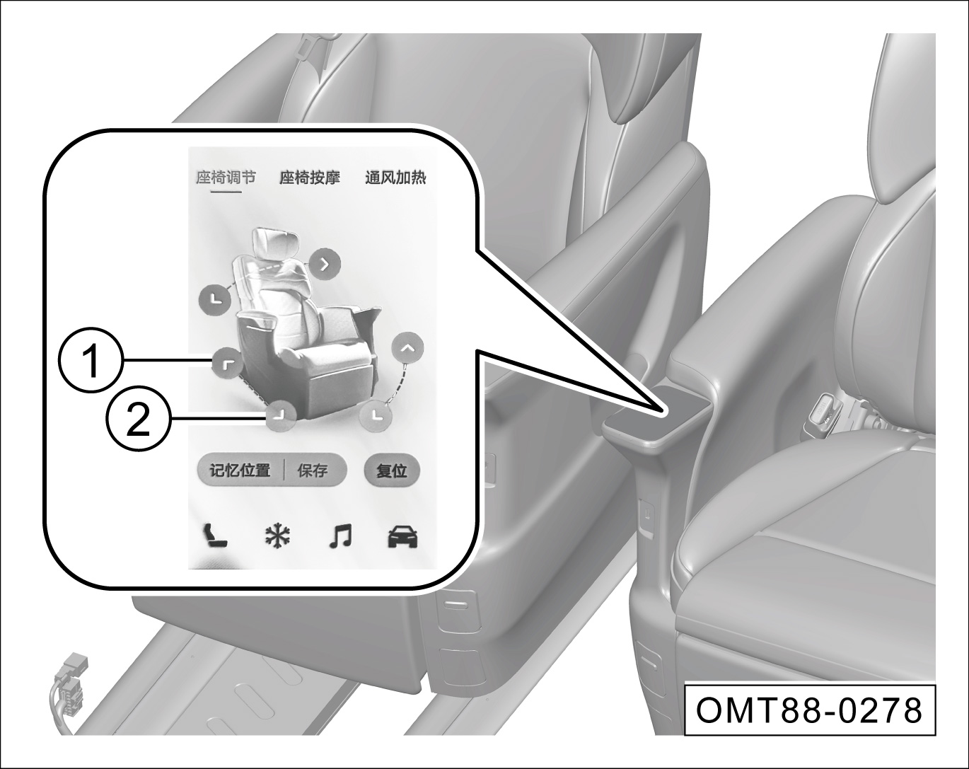 软按键进入座椅控制界面,再点击座椅调节软按键,然后点击软按键①或软按键②,可分别开启向上和向前支撑腿托、向下和向后缩回腿托。