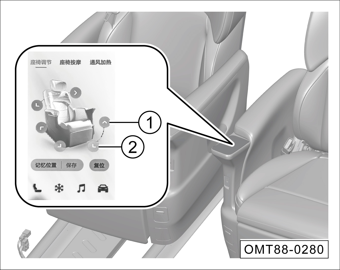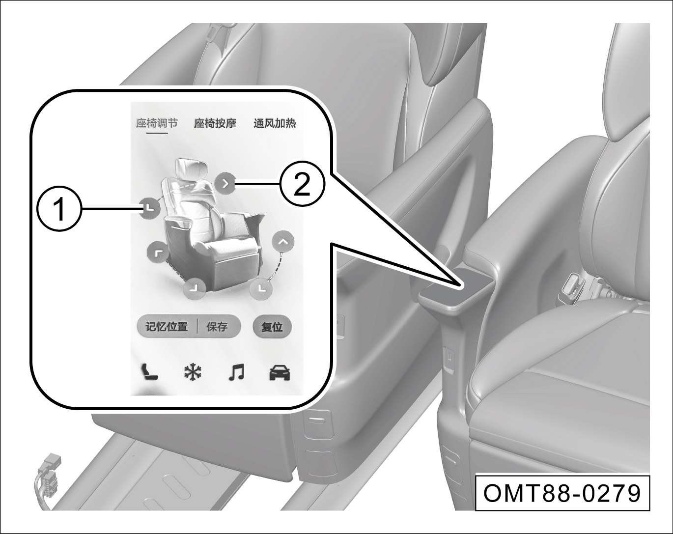 软按键进入座椅控制界面,再点击座椅调节软按键,然后点击软按键①或软按键②,可调节座椅向前或向后滑动。