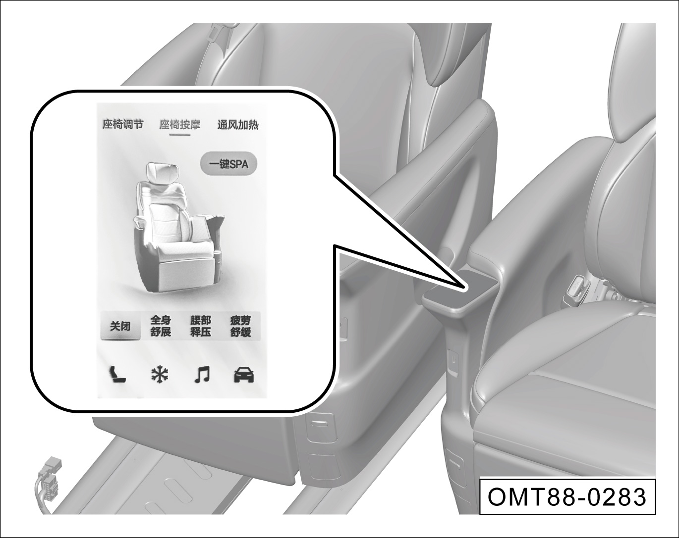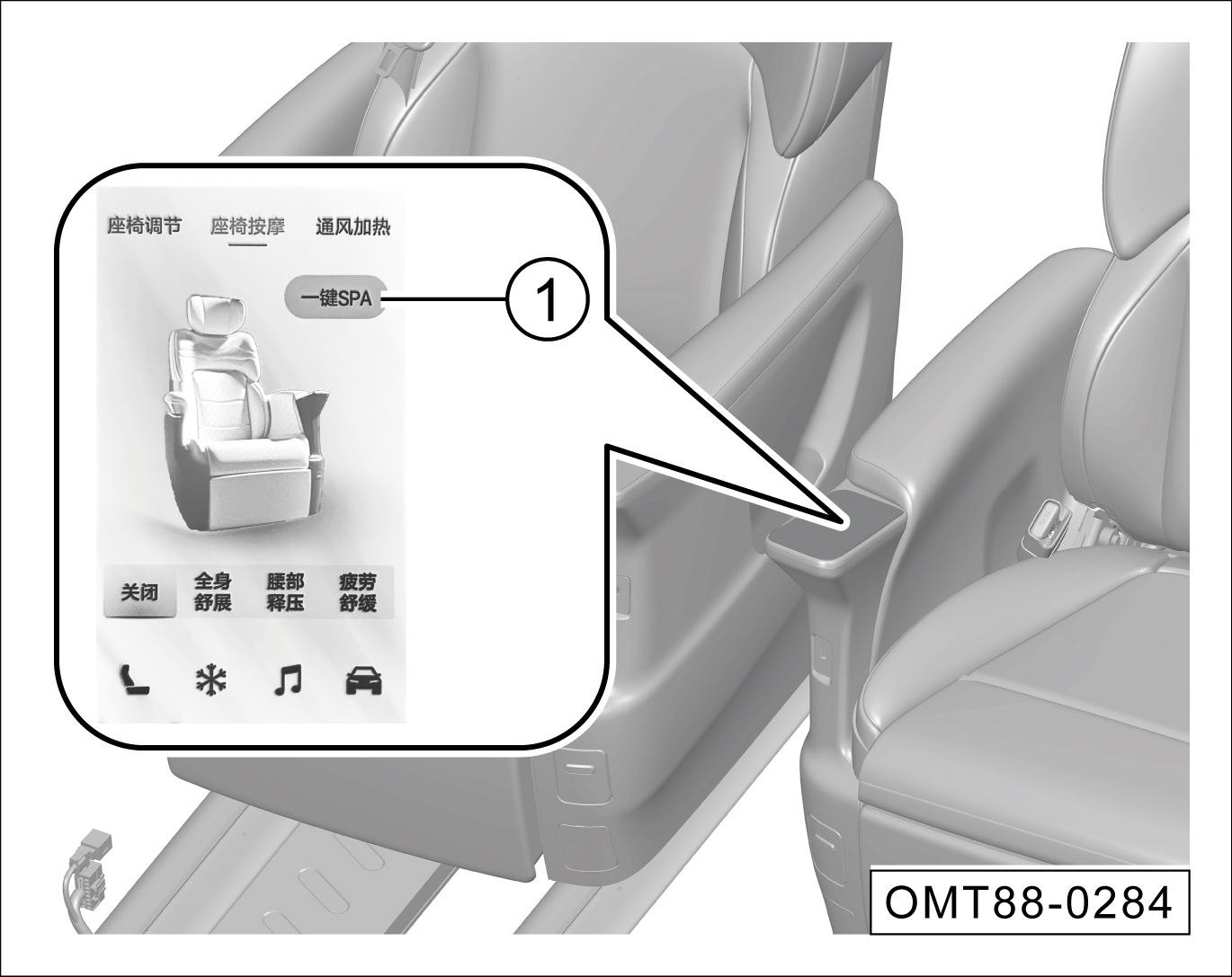 软按键进入座椅控制界面,再点击软按键①开启座椅一键SPA功能,将对氛围灯、座椅放倒舒展、按摩等功能联动,为二排乘员营造SPA的舒享氛围。点击关闭SPA软按键,退出一键SPA功能并恢复该功能开启前的状态。
