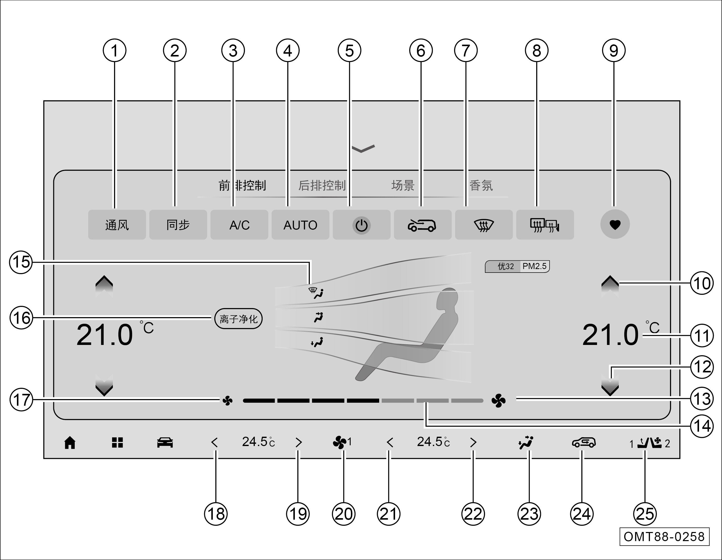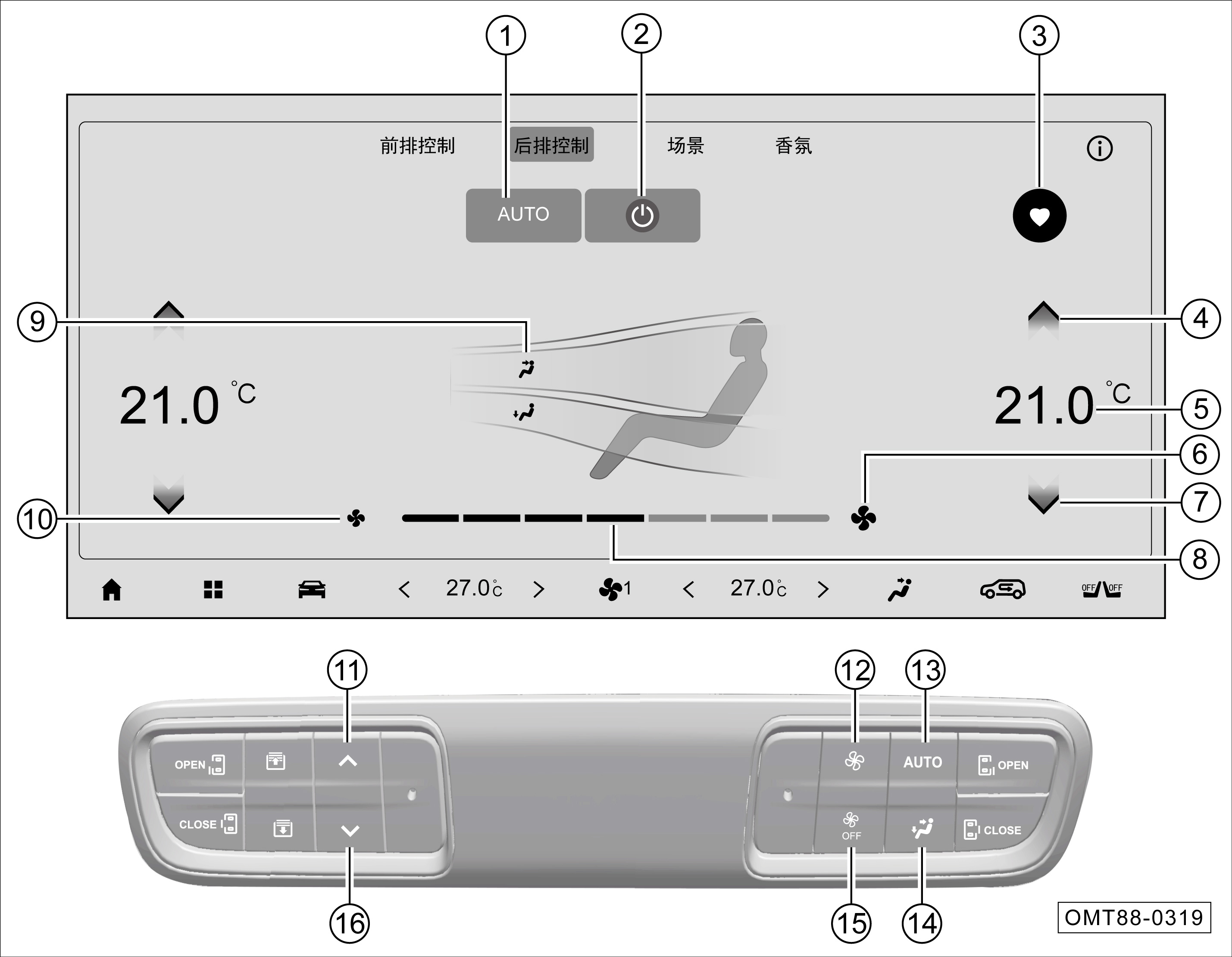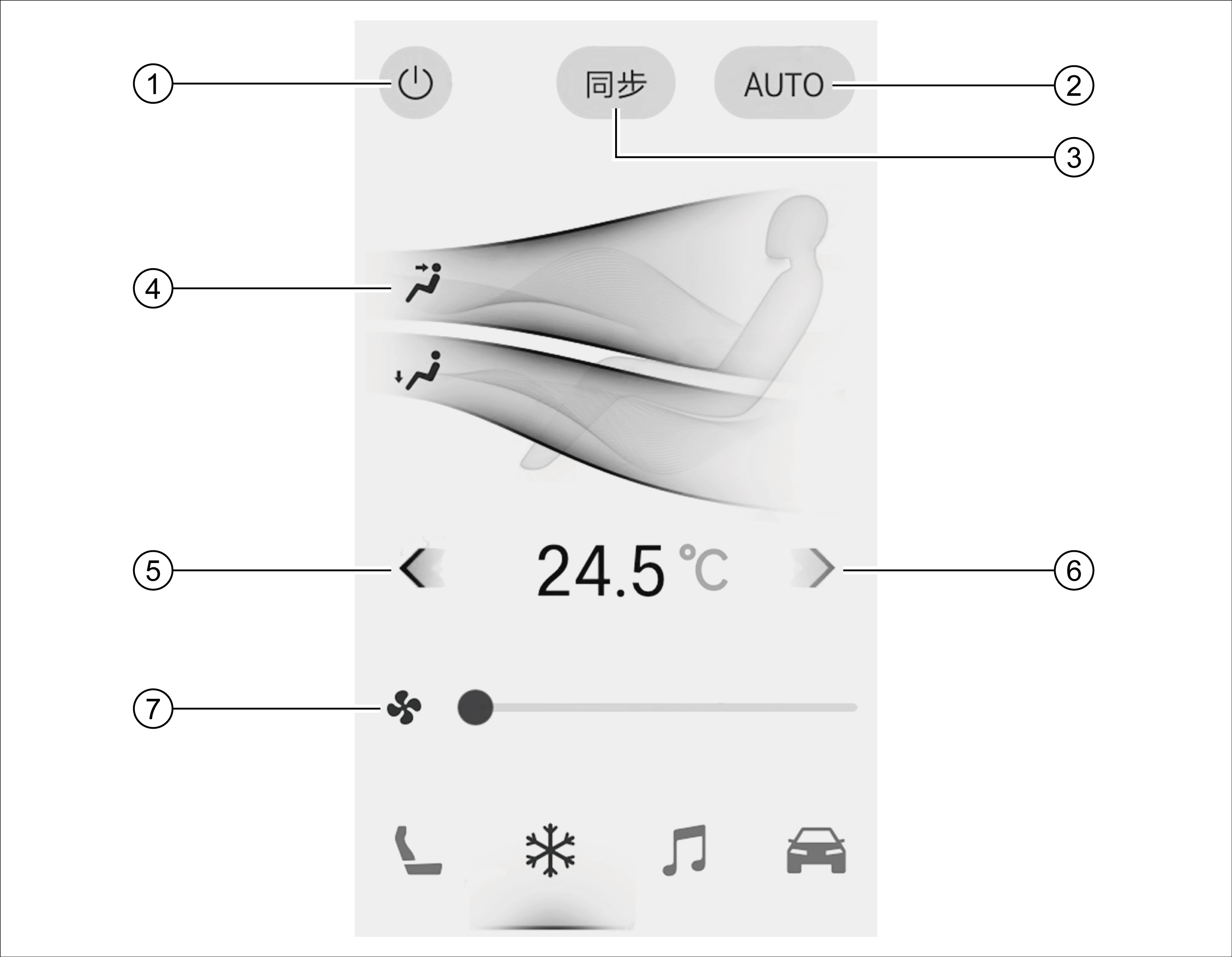 音响系统切换到空调系统控制界面,点击“场景”软按键进入空调场景界面。