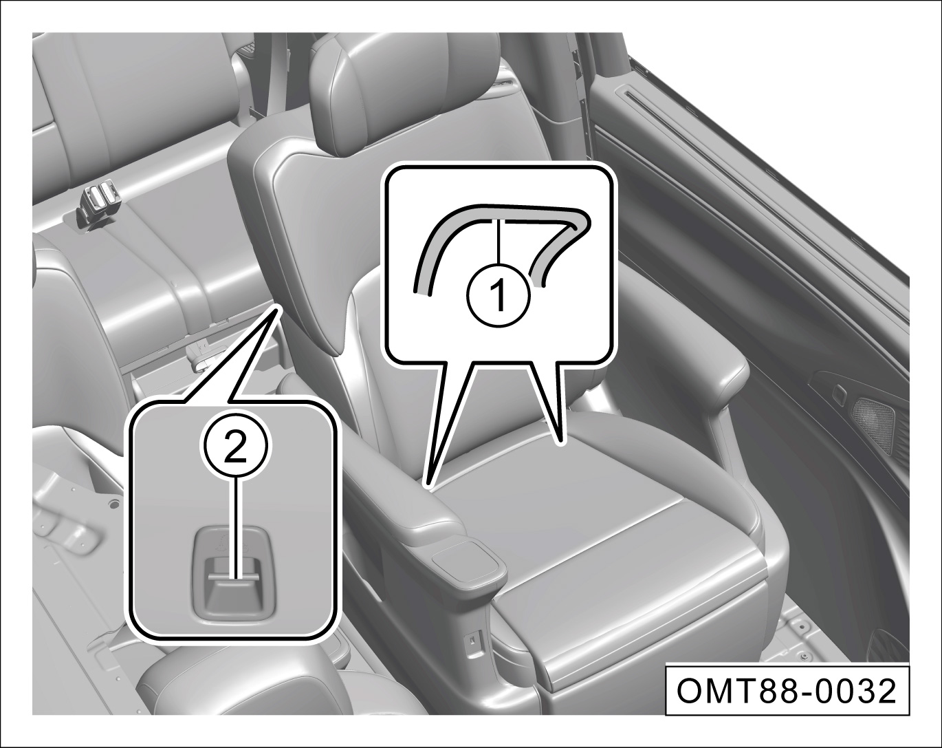 第二排座椅的下固定点①隐藏在其靠背与座垫的缝隙内;上固定点②在座椅靠背的后部。
