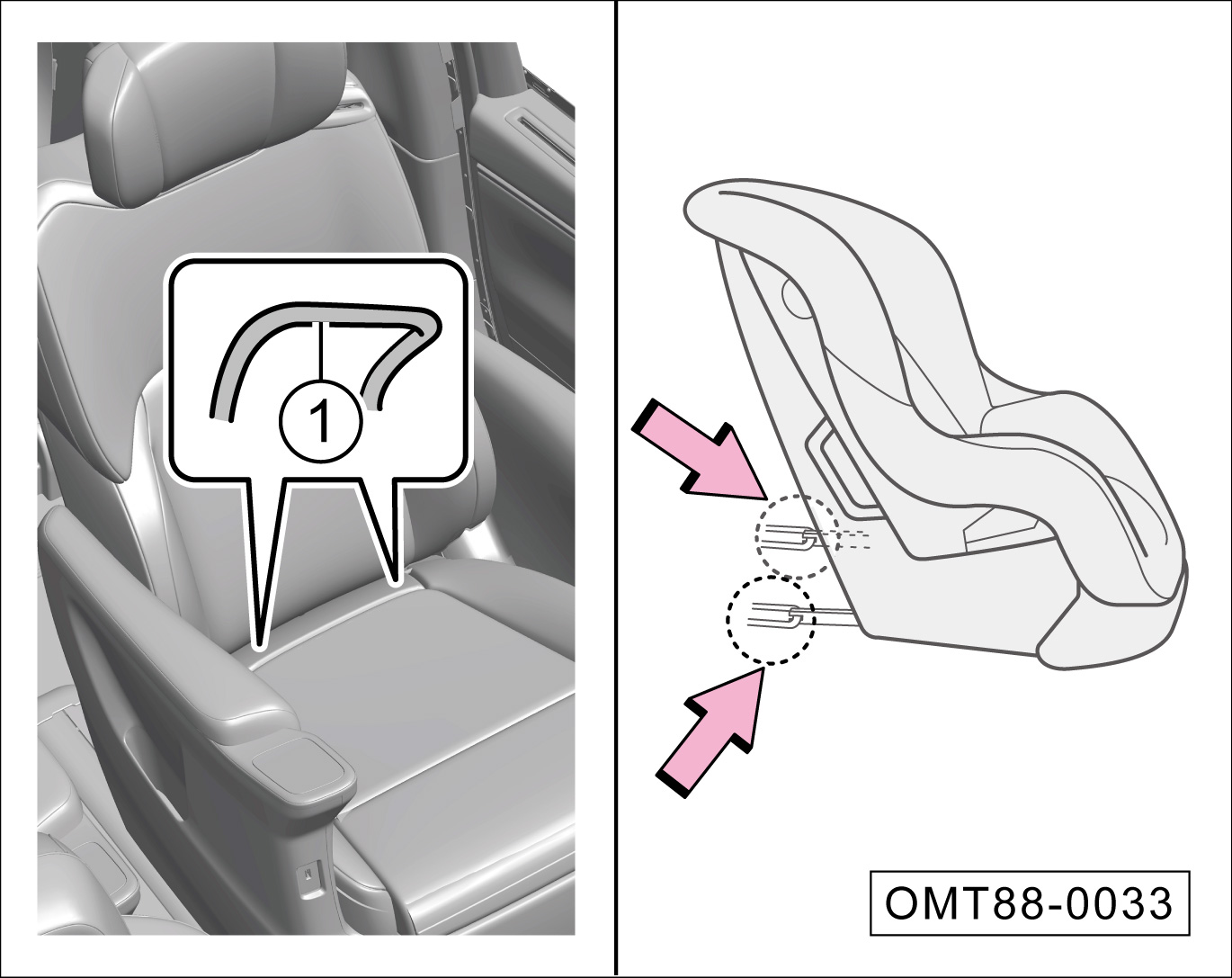 将儿童安全座椅放到座椅上,找到下固定点①,并将儿童安全座椅下安装导槽–箭头–插入下固定点①上,直到听到扣合声。