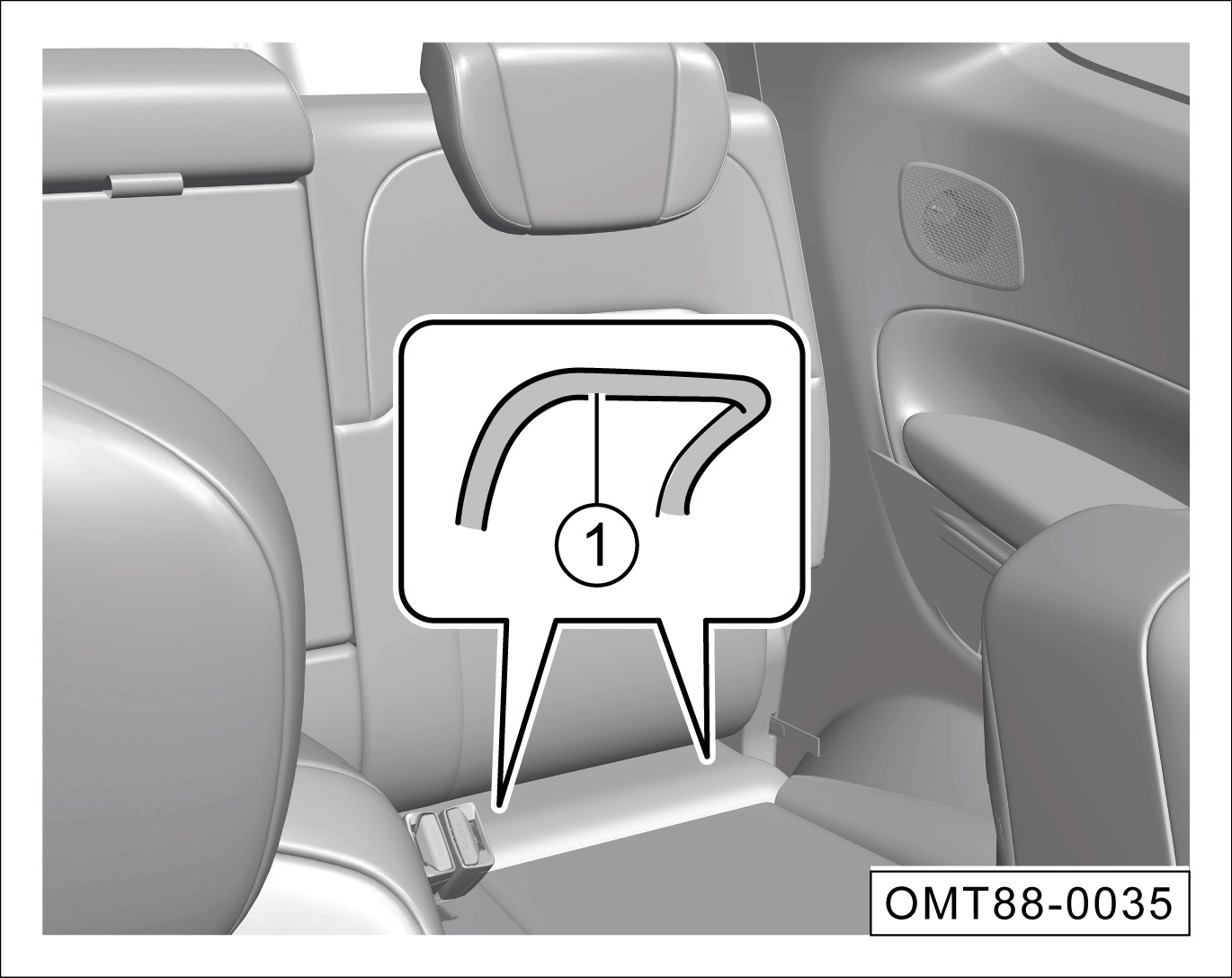 第三排座椅的下固定点①隐藏在其靠背与座垫的缝隙内。