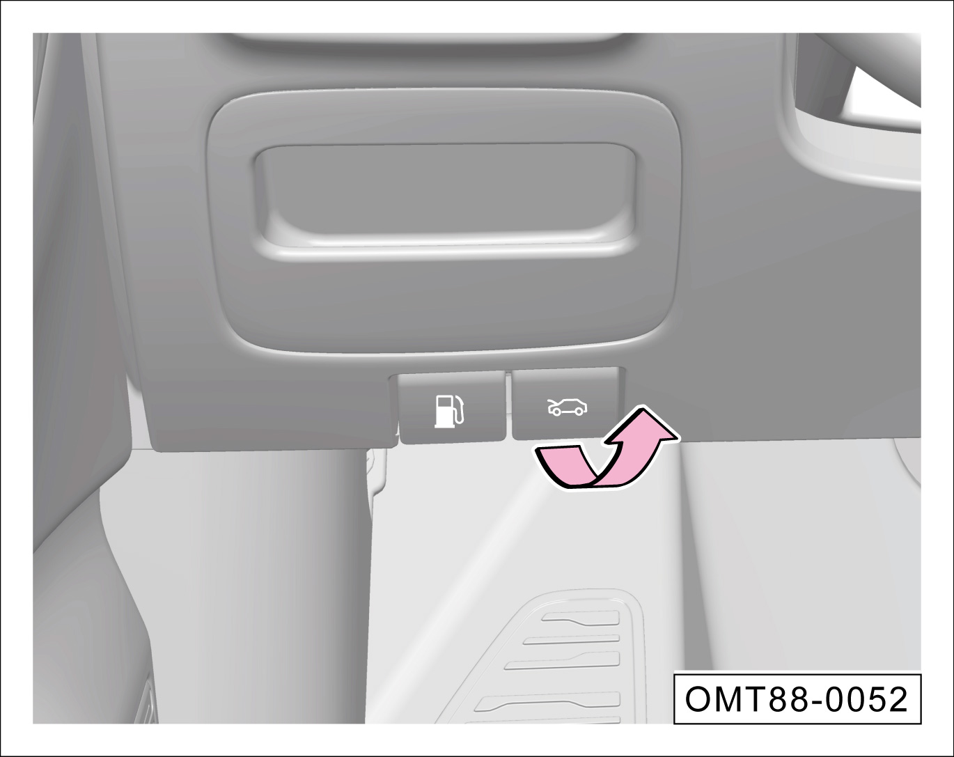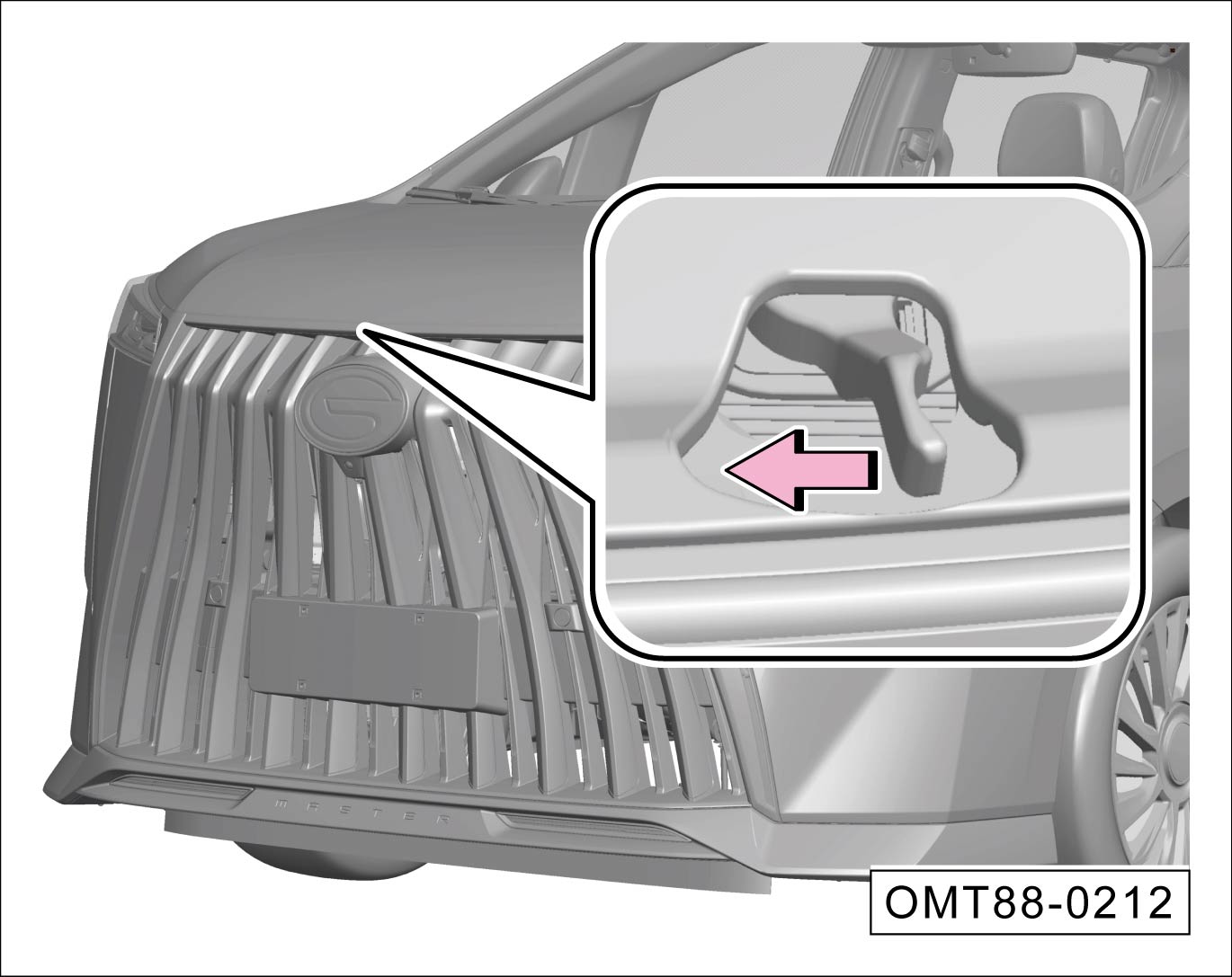 沿-箭头-方向拉驾驶员侧仪表板下方的前机舱盖开启拉手,前机舱盖将解锁并轻微弹起。