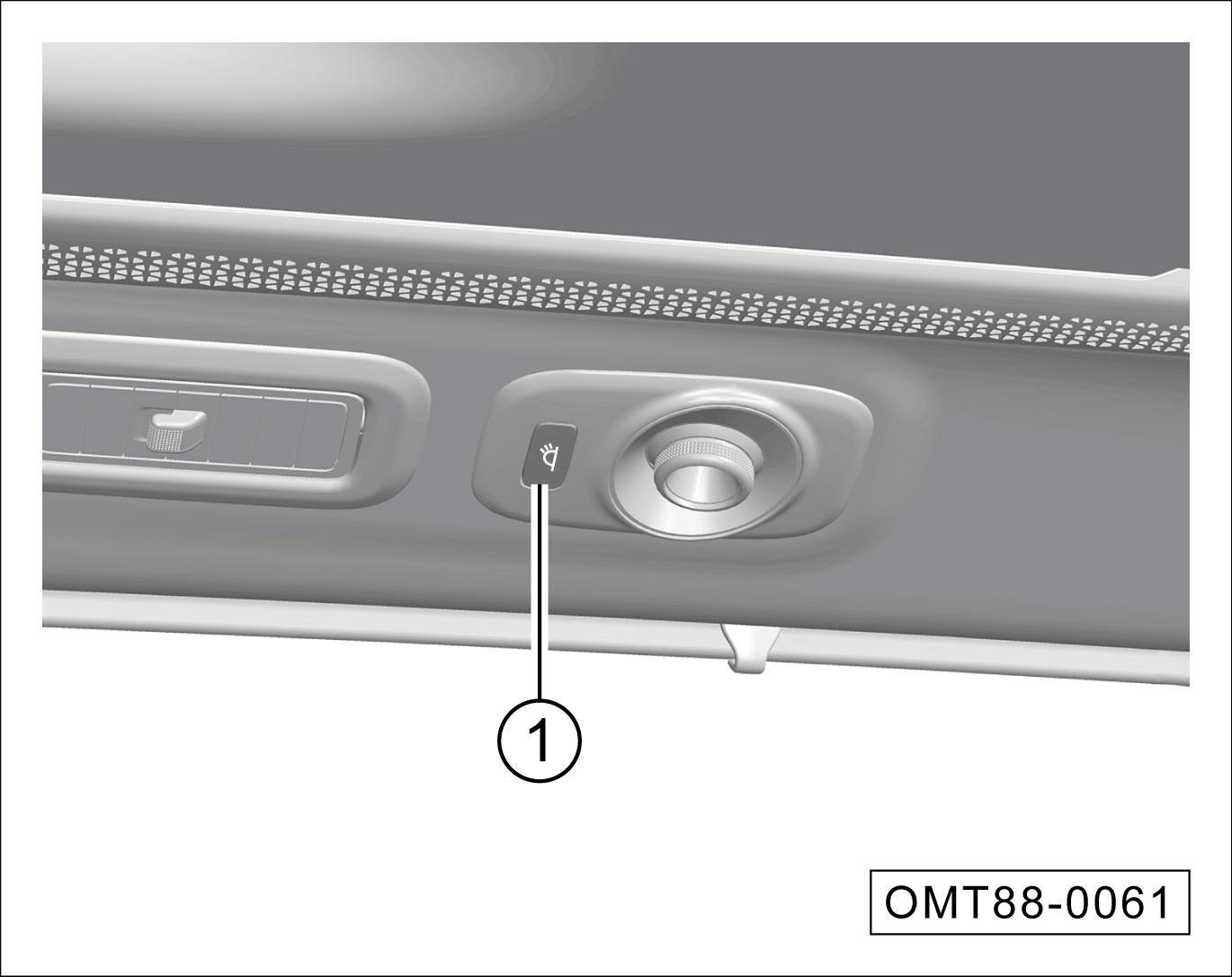 第二排车顶阅读灯熄灭时,按一下开关①,对应侧的阅读灯点亮;再次按开关①,对应侧的阅读灯熄灭。