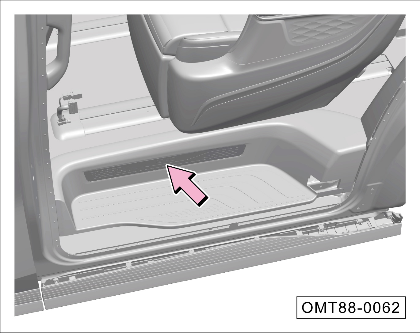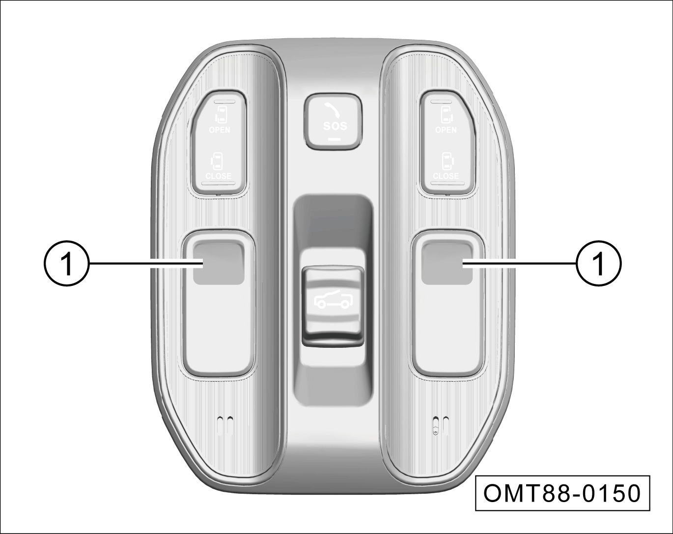 第二排/第三排车顶照明灯熄灭时,按一下开关①,对应侧的照明灯点亮;再次按开关①,对应侧的照明灯熄灭。