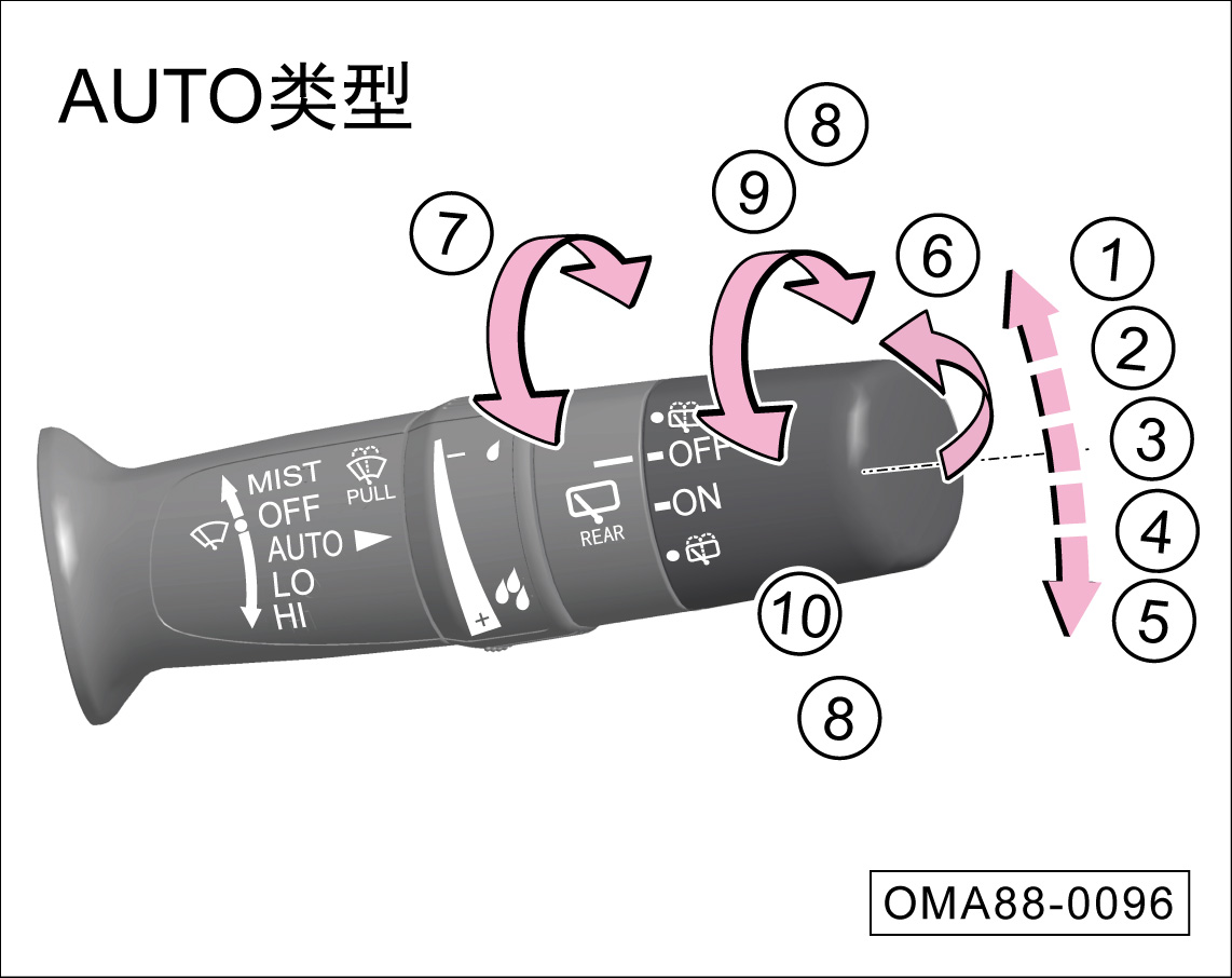 整车电源在“ON”挡时,可操作刮水器组合开关:
