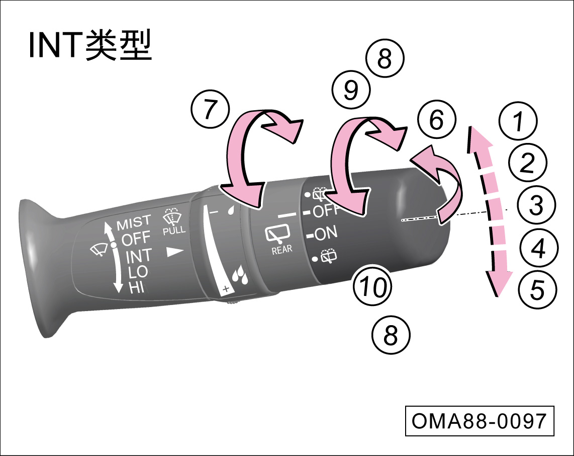 上/下转动旋钮⑦,可调节间歇刮水的时间,从上往下时间依次增加。