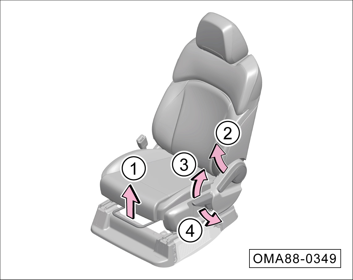 沿-箭头③-或-箭头④-方向掰动开关,可调节座椅座垫前端升高或降低。
