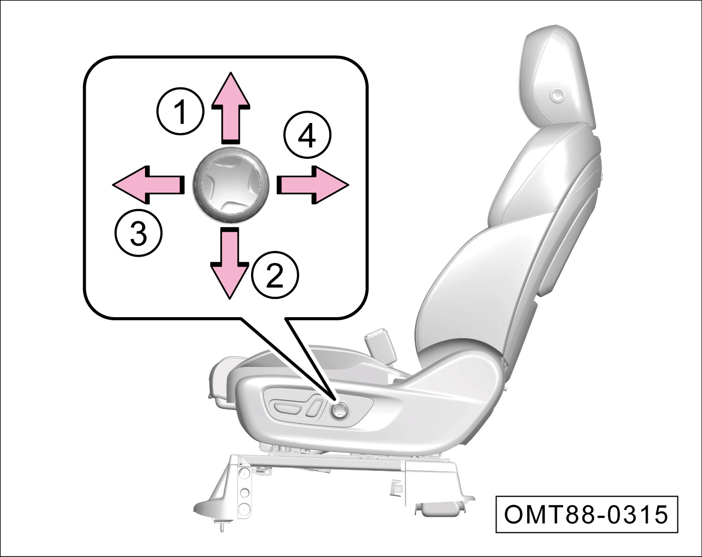 沿-箭头③-或-箭头④-方向掰动开关,可调节座椅升高或降低。