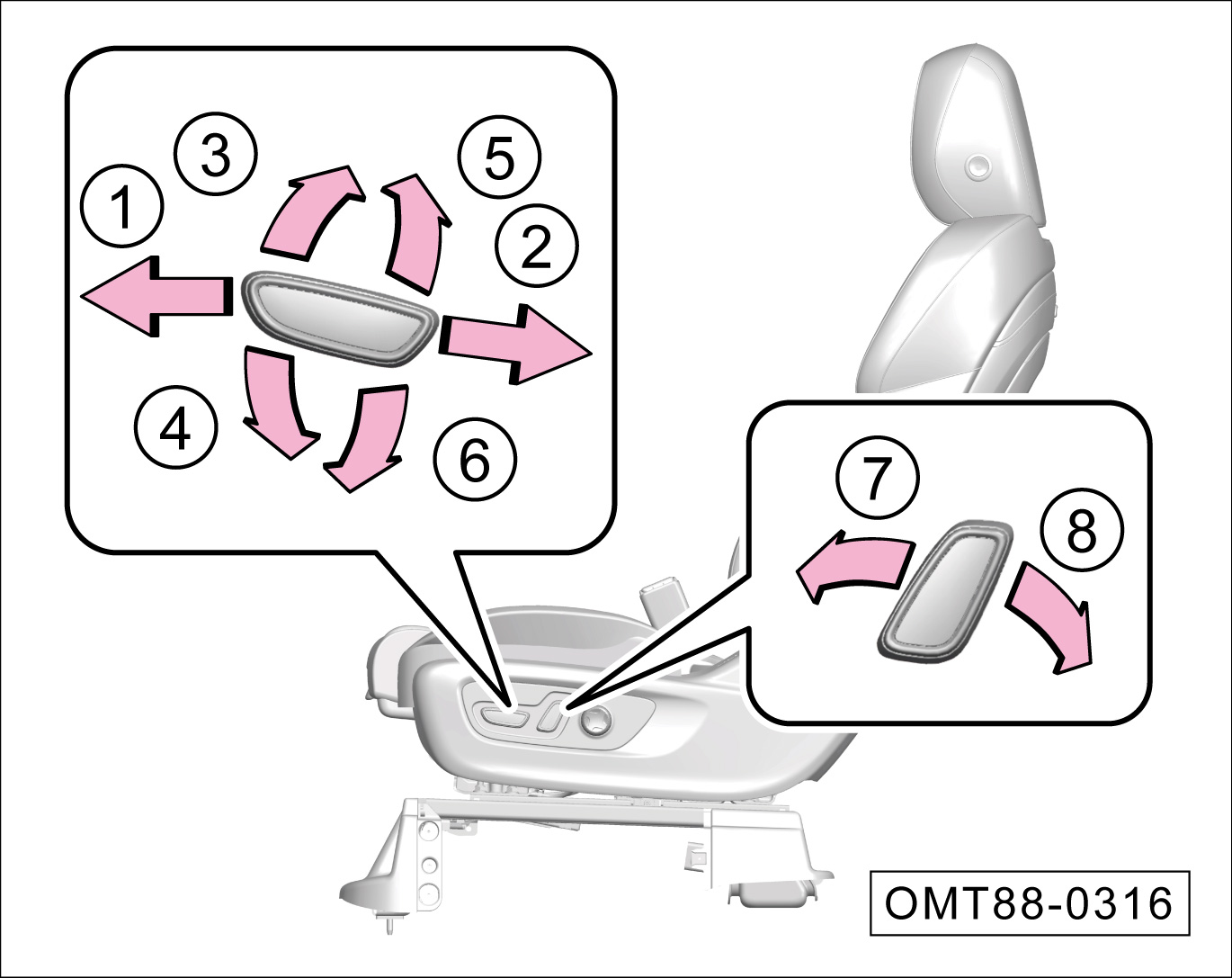 沿-箭头⑤-或-箭头⑥-方向掰动开关,可调节座椅升高或降低。