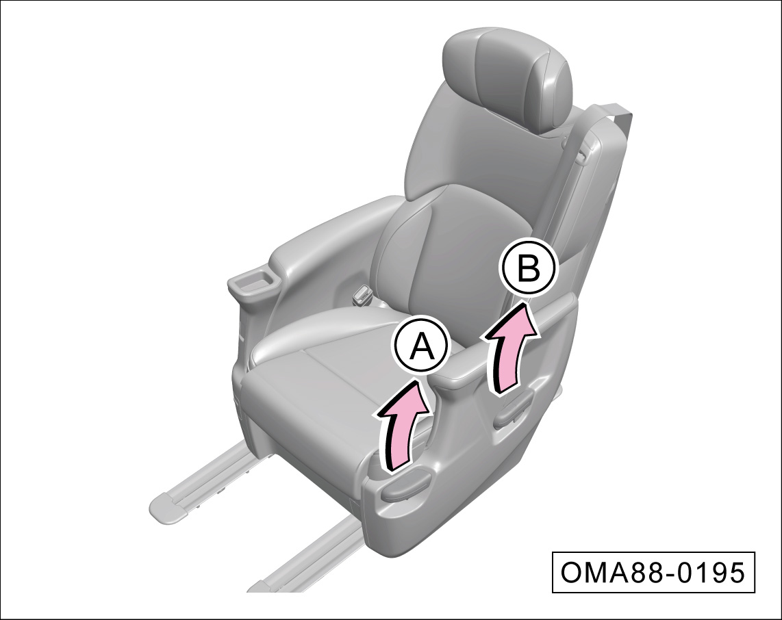 沿-箭头A-方向拉起调整手柄,可调节座椅向前或向后滑动。松开调整拉手后,略微前后滑动座椅直至座椅锁止机构卡牢。