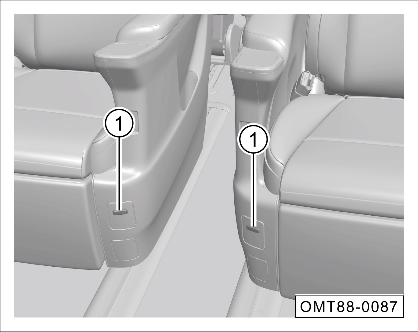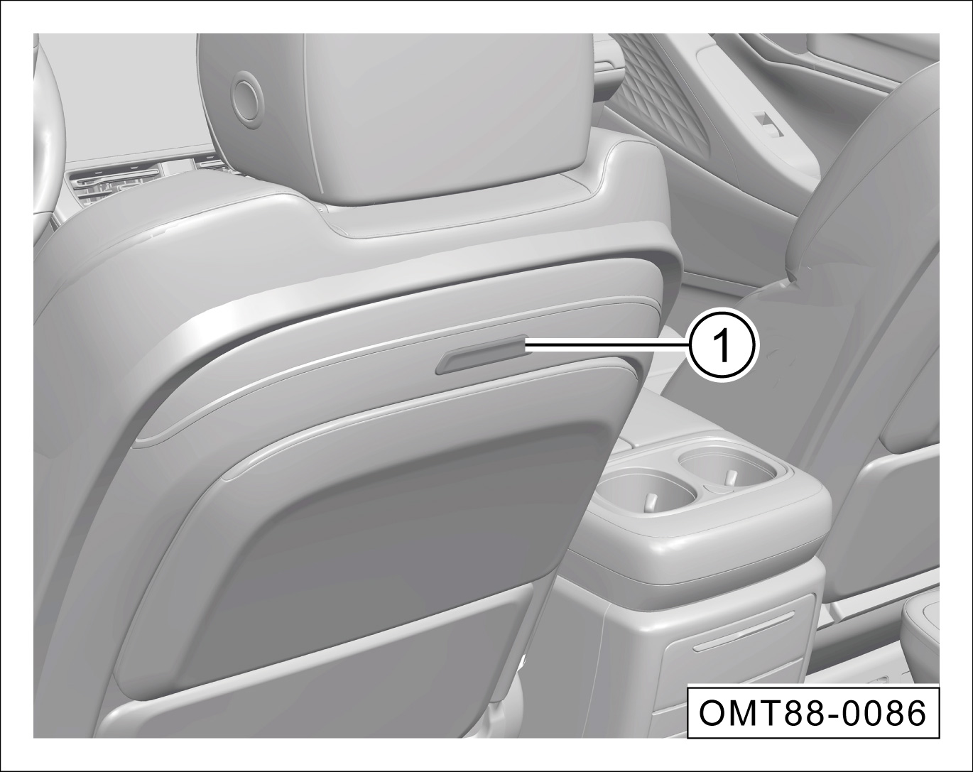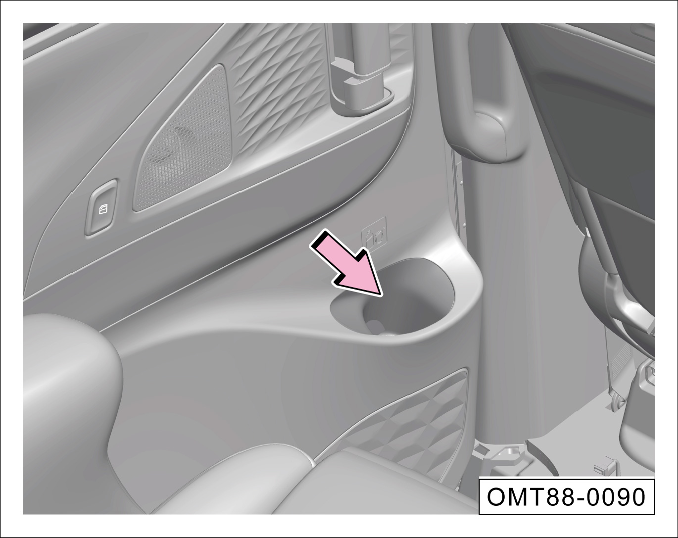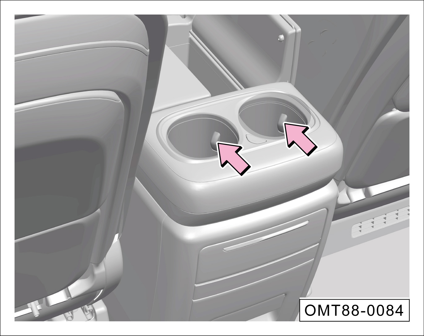 按压第二排座椅下方按键①,弹出隐藏式杯架,可放置饮料瓶。