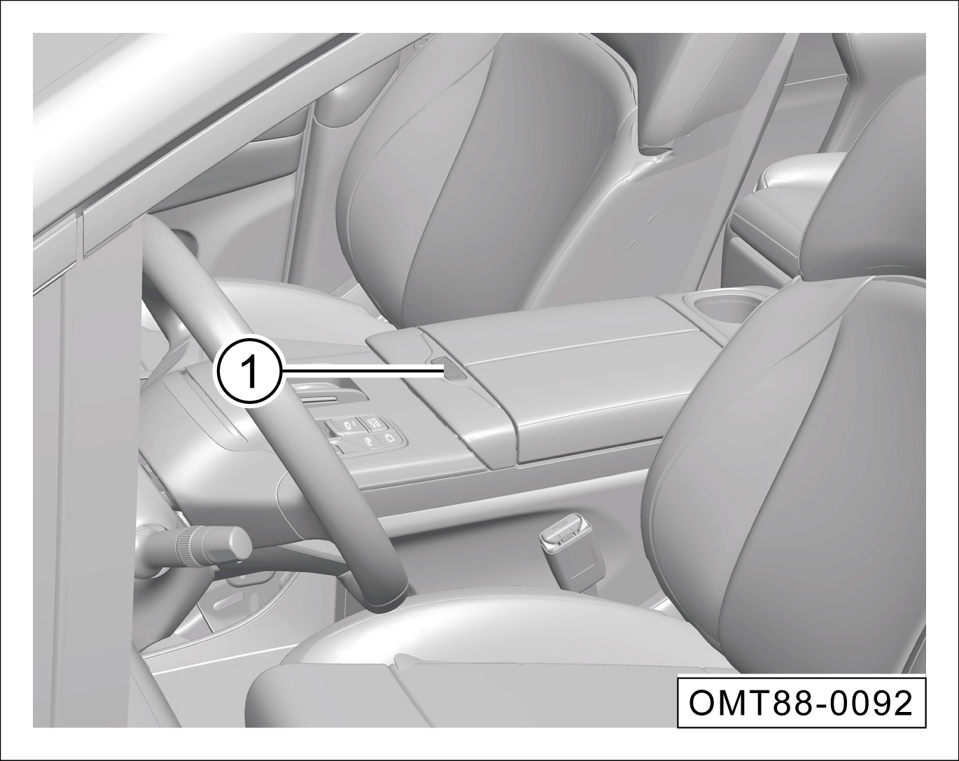 按压开关①打开前排中央扶手箱盖,可放置钱包等物品。