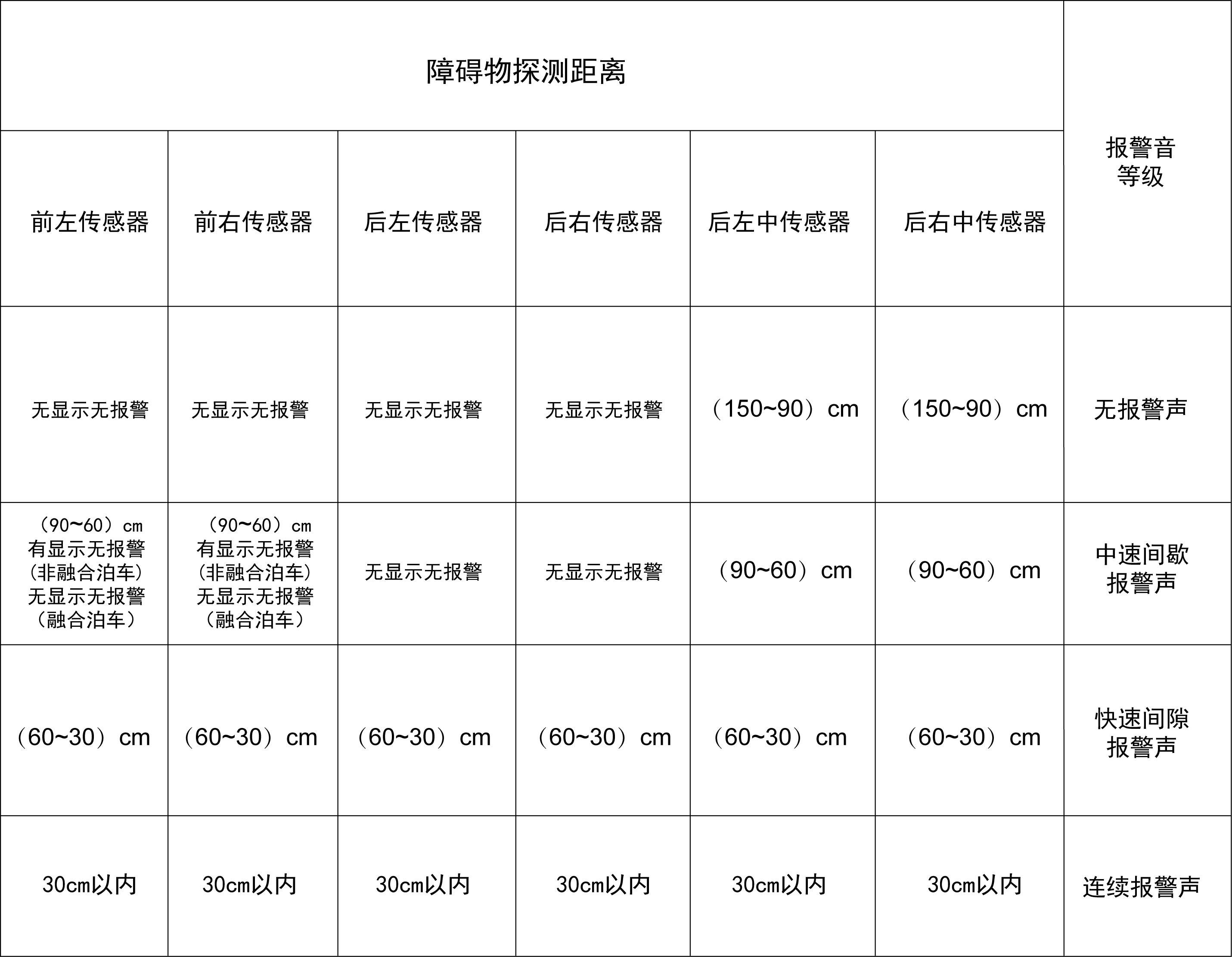 报警声随着障碍物与前后保险杠之间的距离变化,同时在音响系统显示屏上显示的颜色也相应变化。