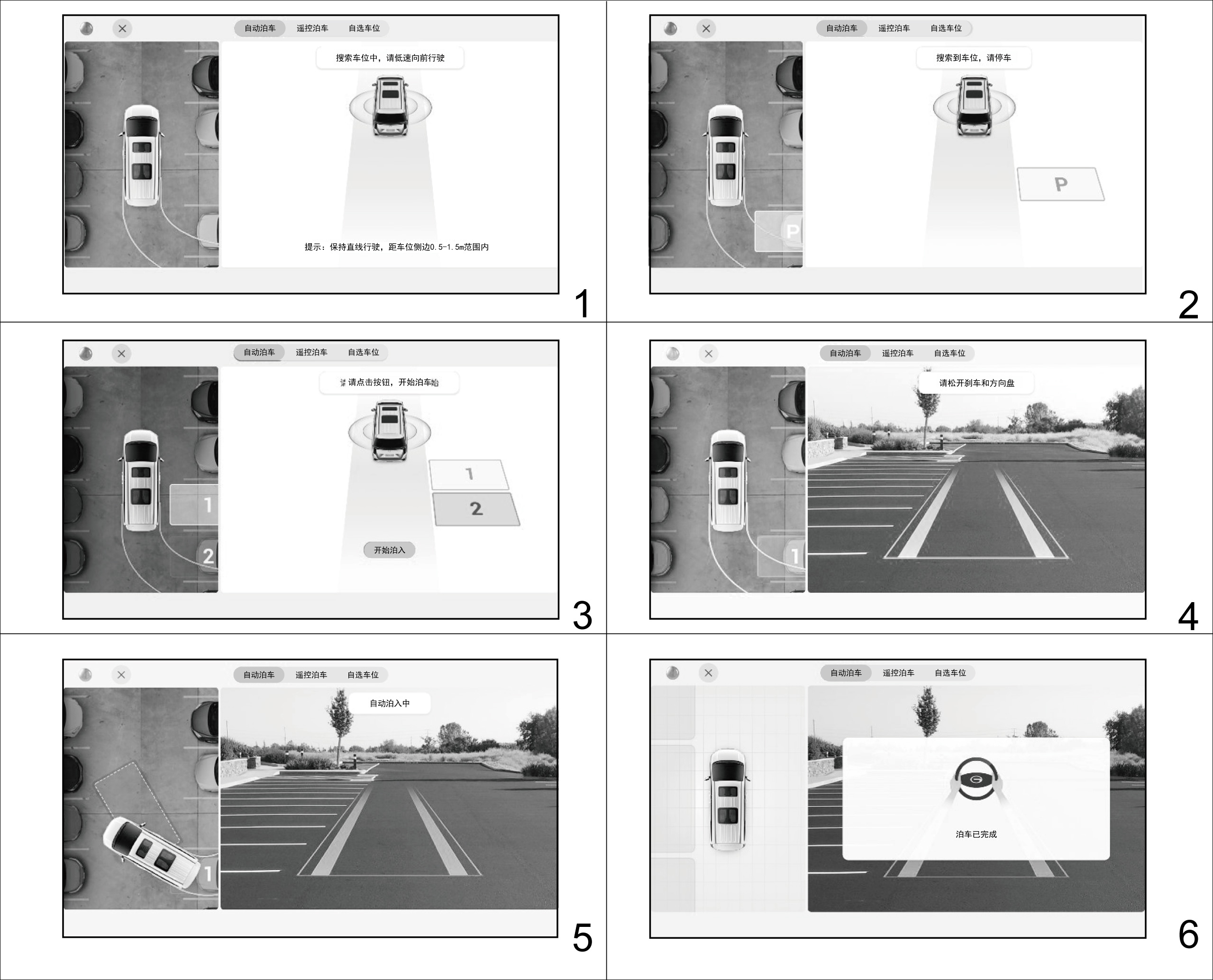 开始泊车后,根据提示松开刹车和方向盘。