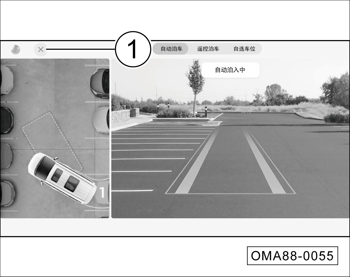 点击音响系统融合泊车界面左上角软按键①,关闭融合泊车系统。