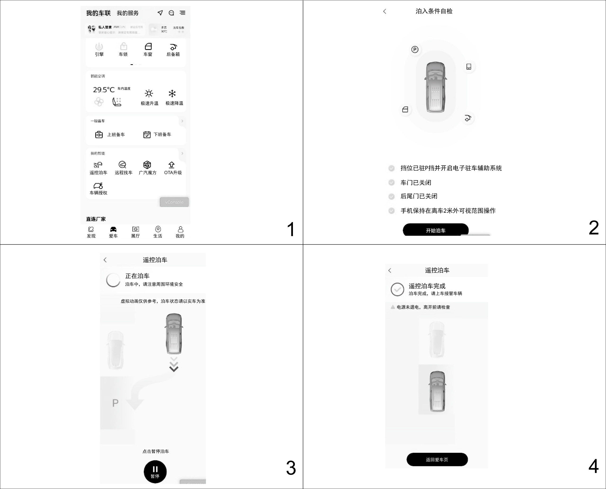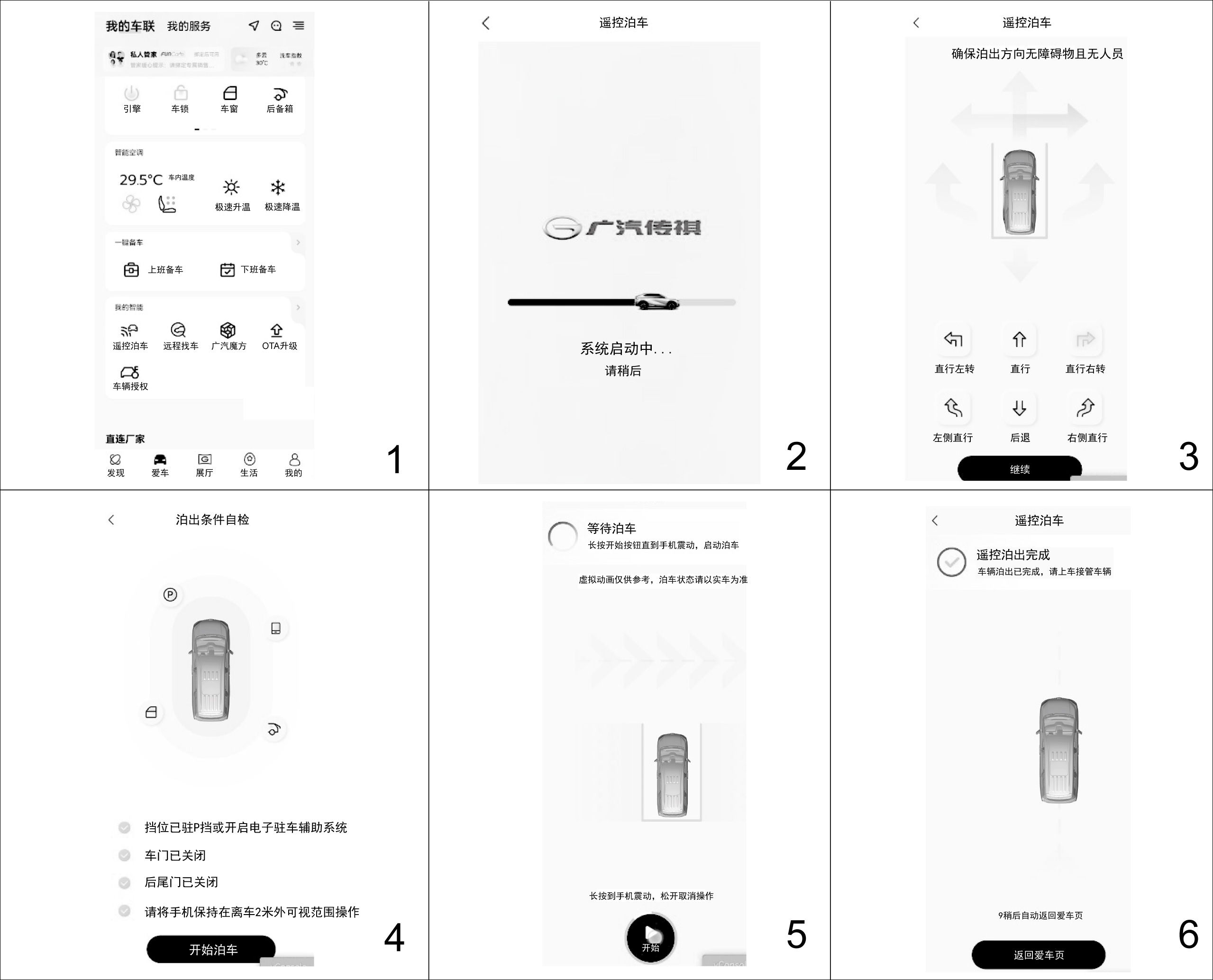 驾驶员可点击手机APP中的“遥控泊车”,当系统判断到驾驶员意图泊出车辆时,进入遥控泊出界面。