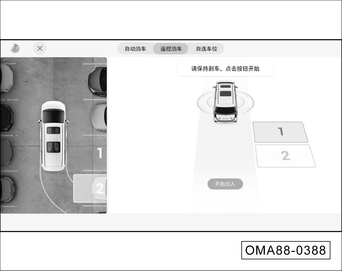 点击音响系统显示屏“遥控泊车”软按键,按提示操作开启遥控泊车系统。