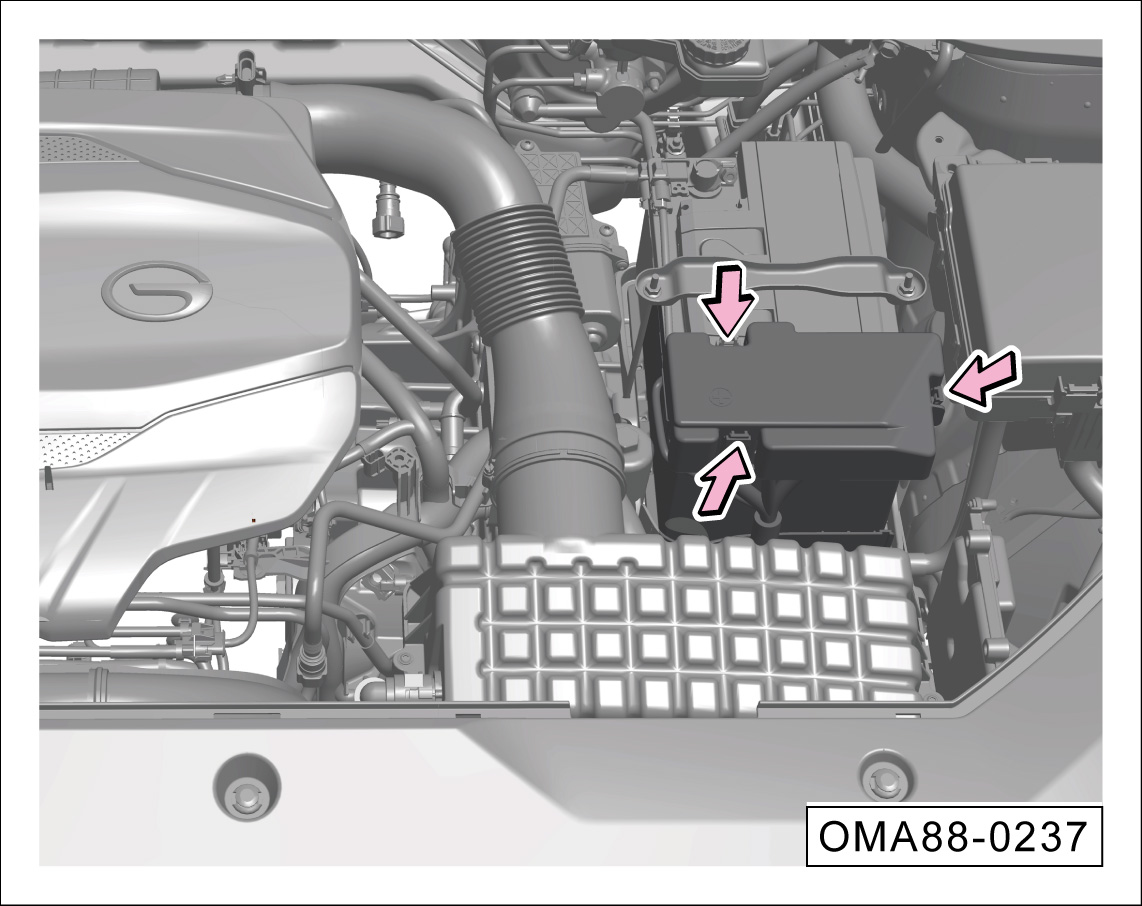 打开前机舱盖,沿-箭头-方向按压固定卡扣取下蓄电池正极盖。